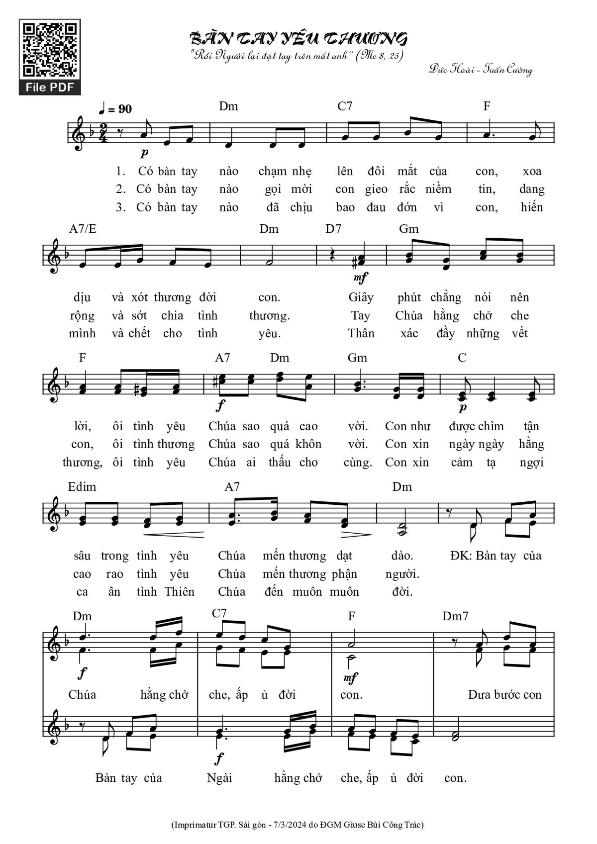 Transposition is the process of moving a song's melody and chords up or down in pitch by a constant interval. The direction of the transposition tool is indicated by a plus (+) sign for up and a minus (-) sign for down. Hover mouse over chords signs to see the chords chart of Bàn tay yêu thương song.
