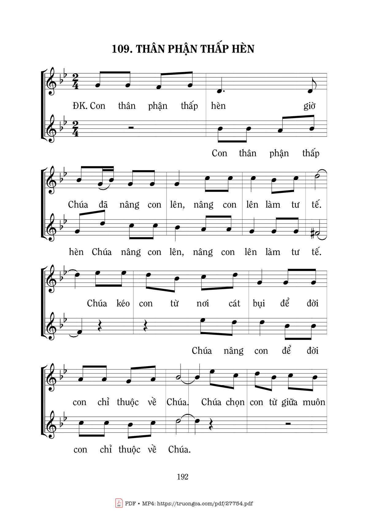 Điệp khúc. Con thân phận thấp hèn giờ Chúa đã nâng con lên, nâng con lên làm tư tế. Chúa kéo con từ nơi cát bụi để đời con chỉ thuộc về Chúa. Chúa chọn con từ giữa muôn người, giữ gìn con tinh tuyền Chúa ơi.