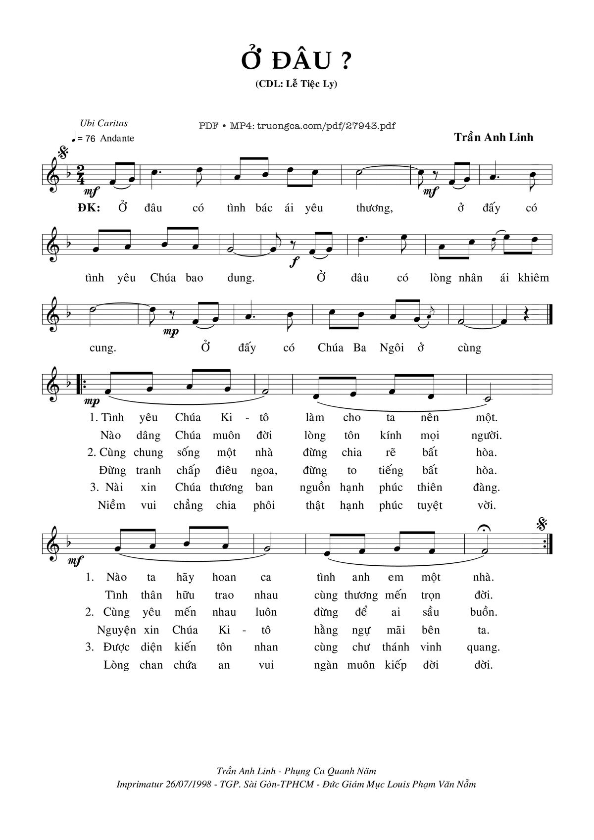 Điệp khúc. Ở đâu có tình bác ái yêu thương ở đấy có tình yêu Chúa bao dung. Ở đâu có lòng nhân ái khiêm cung. Ở đấy có Chúa Ba Ngôi ở cùng.