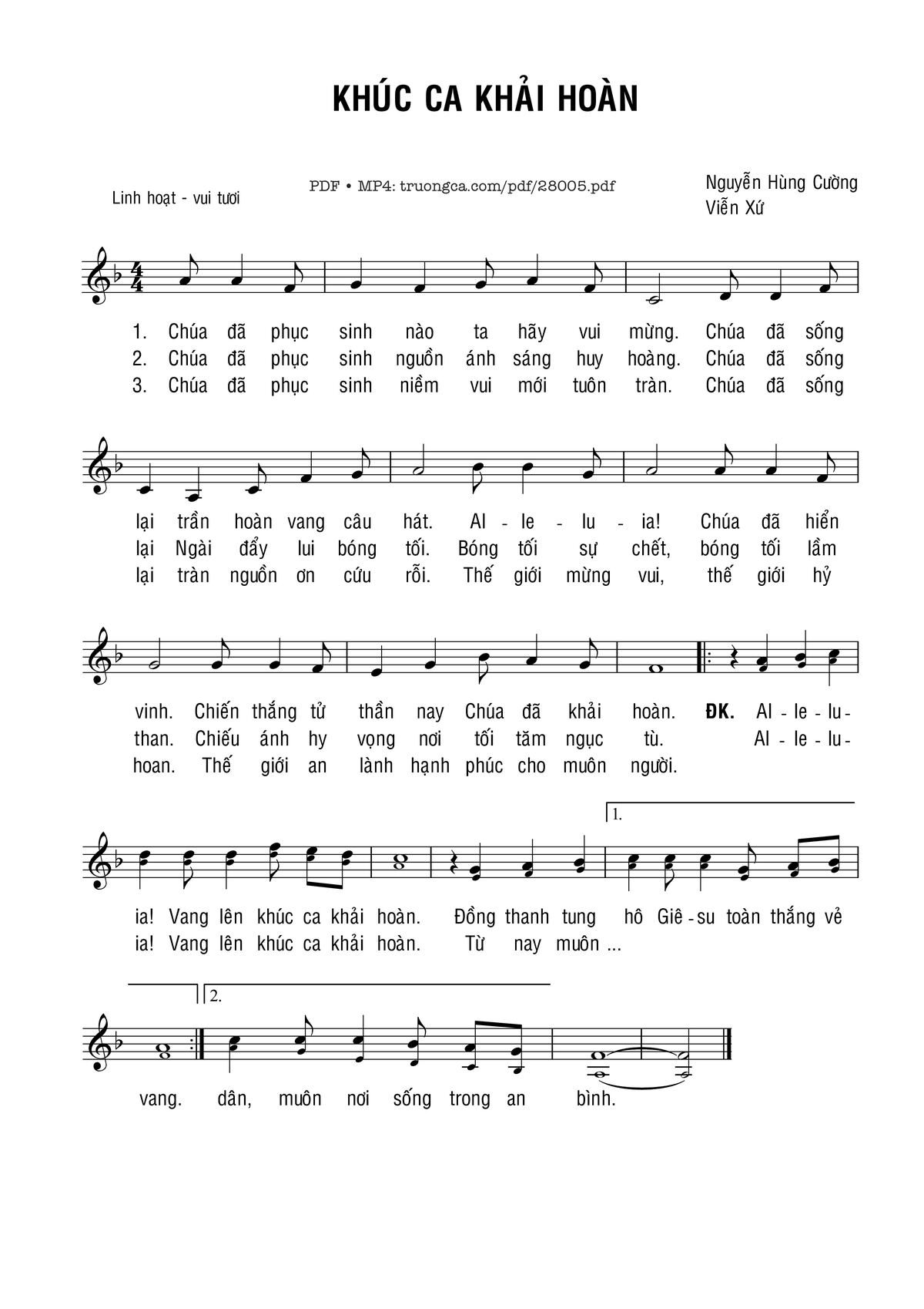 Điệp khúc. Alleluia! Vang lên khúc ca khải hoàn. Đồng thanh tung hô Giêsu toàn thắng vẻ vang. Alleluia! Vang lên khúc ca khải hoàn. Từ nay muôn dân muôn nơi sống trong an bình.