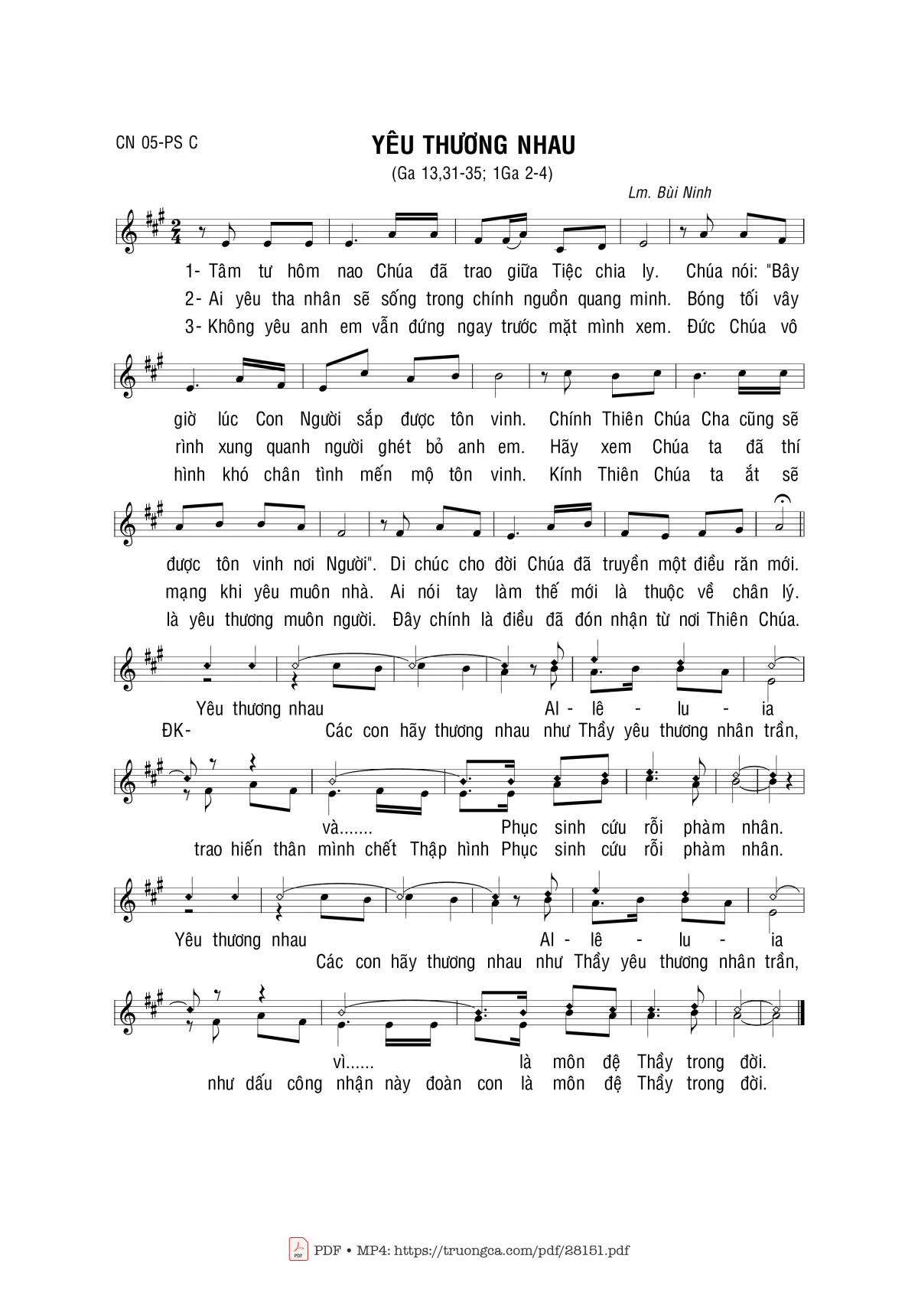 Điệp khúc. Yêu thương nhau các con hãy thương nhau như Thầy yêu thương nhân trần, trao hiến thân mình chết Thập hình Phục sinh cứu rỗi phàm nhân. Yêu thương nhau các con hãy thương nhau như Thầy yêu thương nhân trần, như dấu công nhận này đoàn con là môn đệ Thầy trong đời.