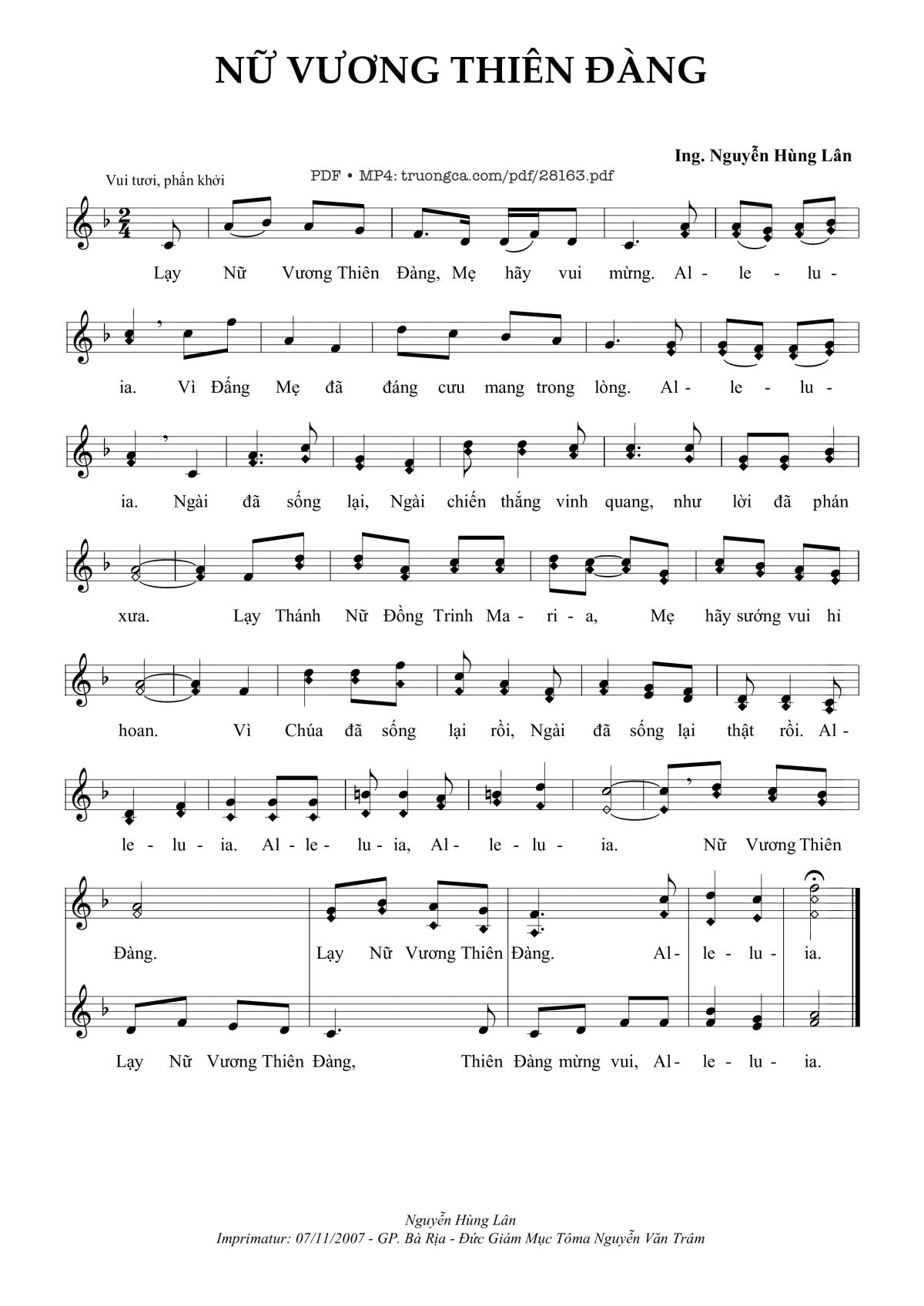 1) Lạy Nữ Vương Thiên Đàng Mẹ hãy hỉ hoan vui sướng. Alleluia! Vì Đấng Mẹ đã đang cưu mang trong lòng. Alleluia. Ngài đã sống lại Ngài chiến thắng vinh quang như lời đã phán xưa. Lạy Thánh Nữ Đồng Trinh Maria Mẹ hãy mừng vui hỷ hoan. Vì Chúa đã sống lại rồi, Ngìa đã sống lại thật rồi. Alleluia. Alleluia. Alleluia. Alleluia. Nữ Vương Thiên Đàng. Lạy Nữ Vương Thiên Đàng Alleluia.