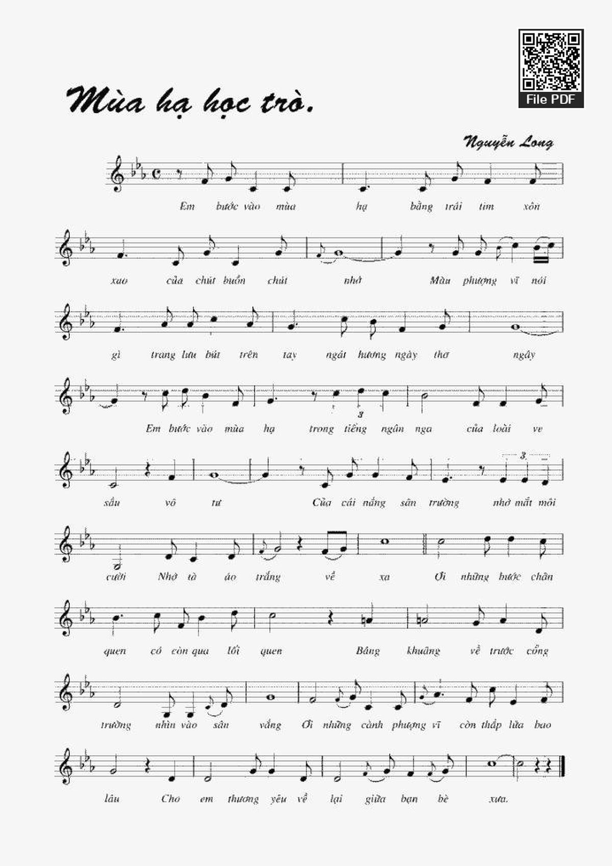 Sheet music Mùa Hạ Học Trò by Nguyễn Long and PDF file was posted here to support you to practice singing perfectly. Sheets with notes and chords are for reference only, for non-commercial purposes only, not involved with earning money by buying and selling. Copyright is belong to song writer/author and copyright owner. Truongca.com do not own any copyrighted content. You can download the high-quality PDF files which contain staffs by PDF link above.