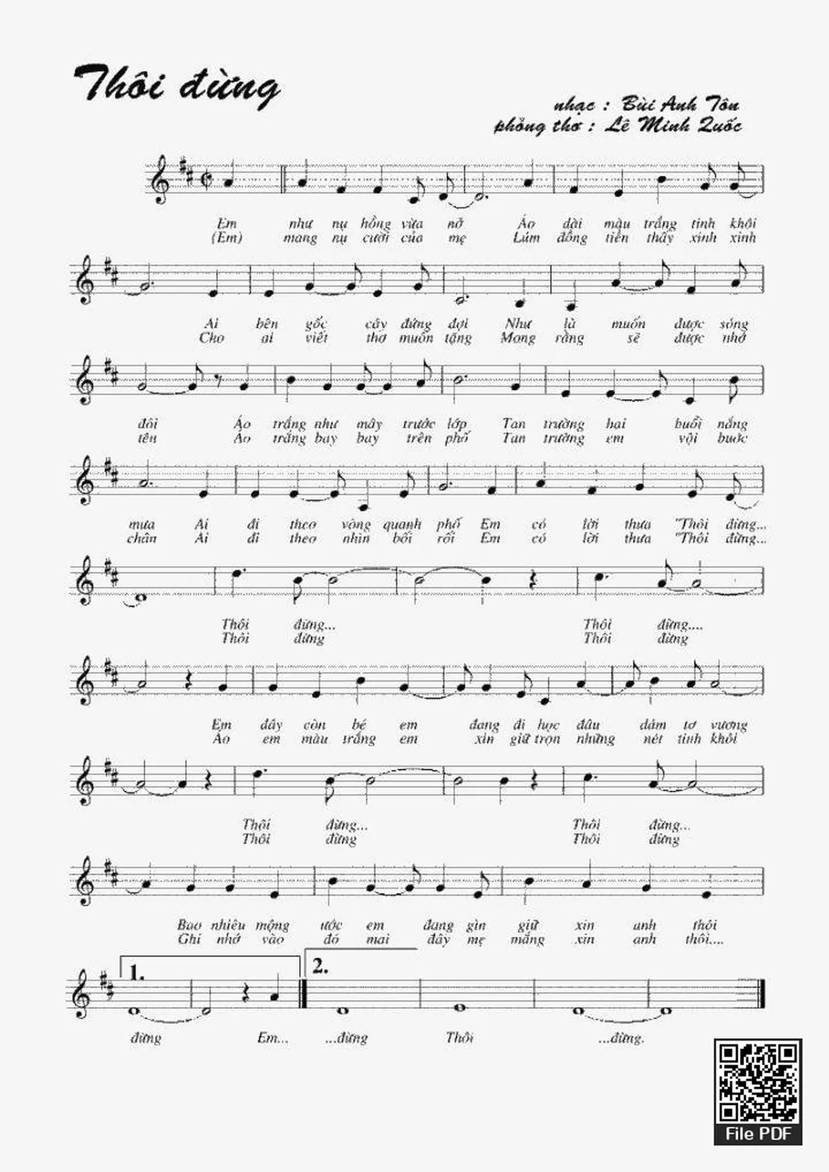 Sheet music Thôi Đừng by Bùi Anh Tôn and PDF file was posted here to support you to practice singing perfectly. Sheets with notes and chords are for reference only, for non-commercial purposes only, not involved with earning money by buying and selling. Copyright is belong to song writer/author and copyright owner. Truongca.com do not own any copyrighted content. You can download the high-quality PDF files which contain staffs by PDF link above.