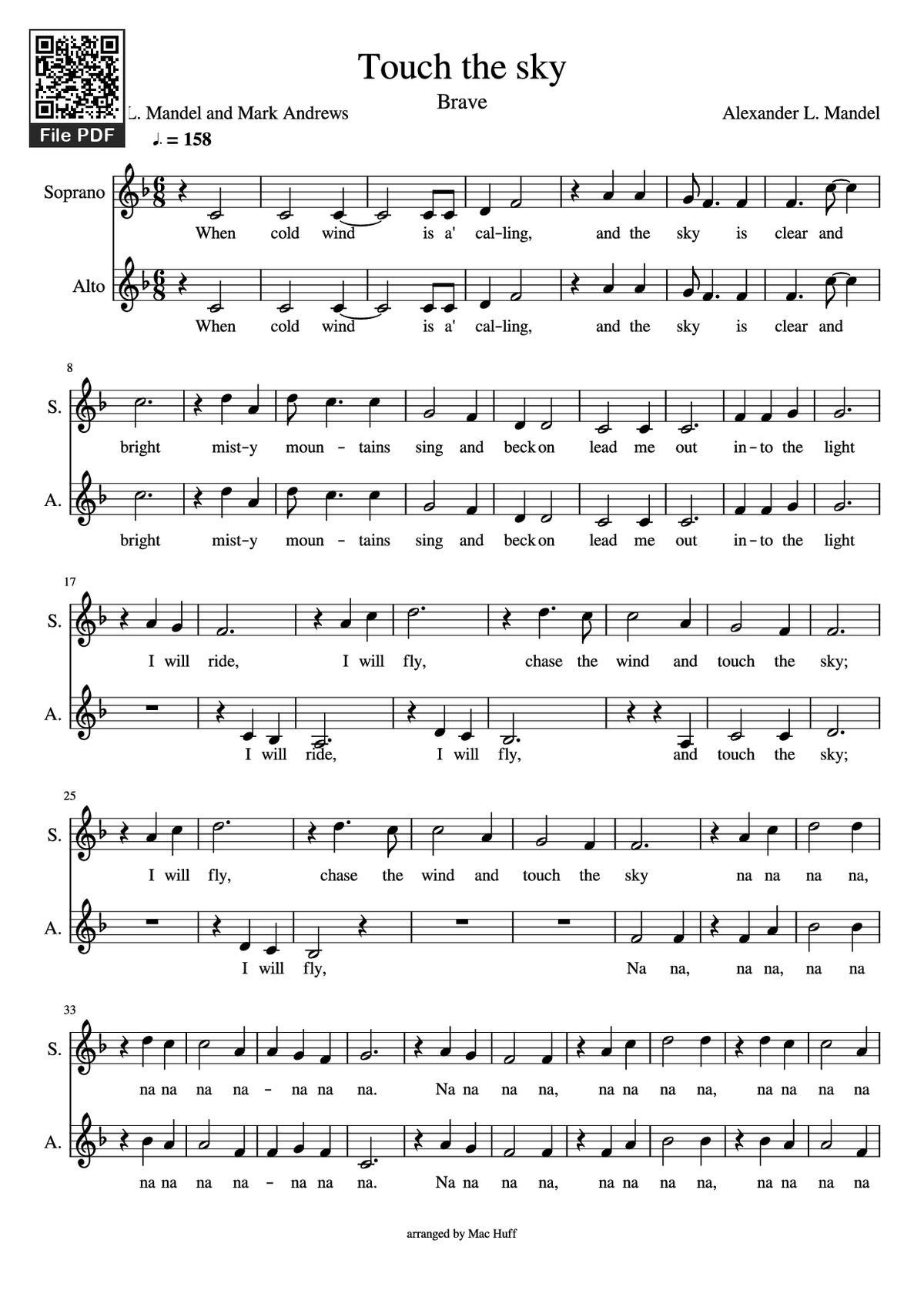 Download and print in PDF or MIDI free sheet music of touch the sky - Julie Fowlis for Touch The Sky by Julie Fowlis arranged by toscalover for Soprano, Alto (Choral)