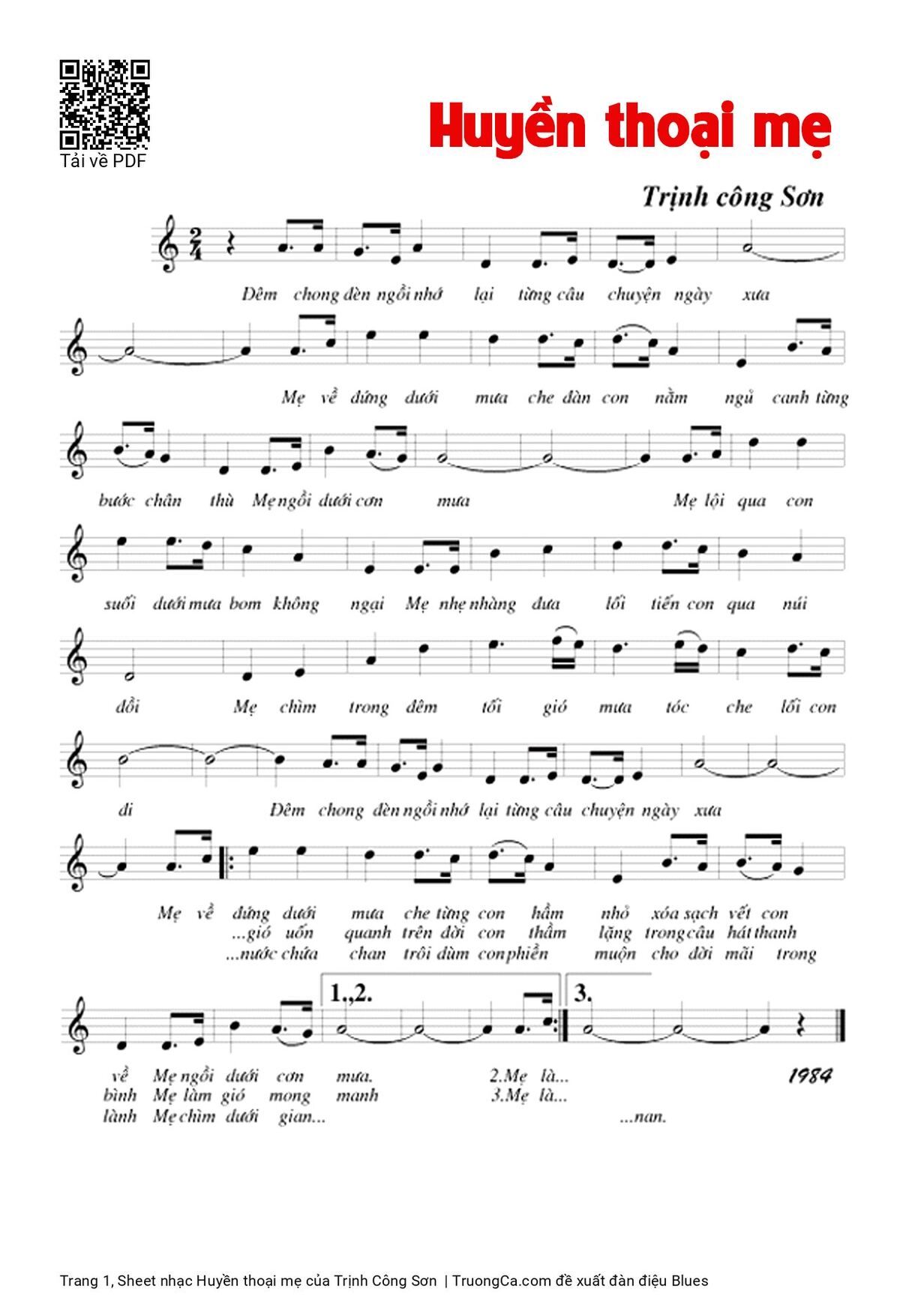The Videos/audios Huyền thoại mẹ by Trịnh Công Sơn were embed from Youtube, Musescore or the other 3rd links. Videos are subject to 3rd's copyright control and may be removed by YouTube's copyright rules and 3rd's policies or maybe included advertisements. If you cannot access to these songs, this mean that have been removed.