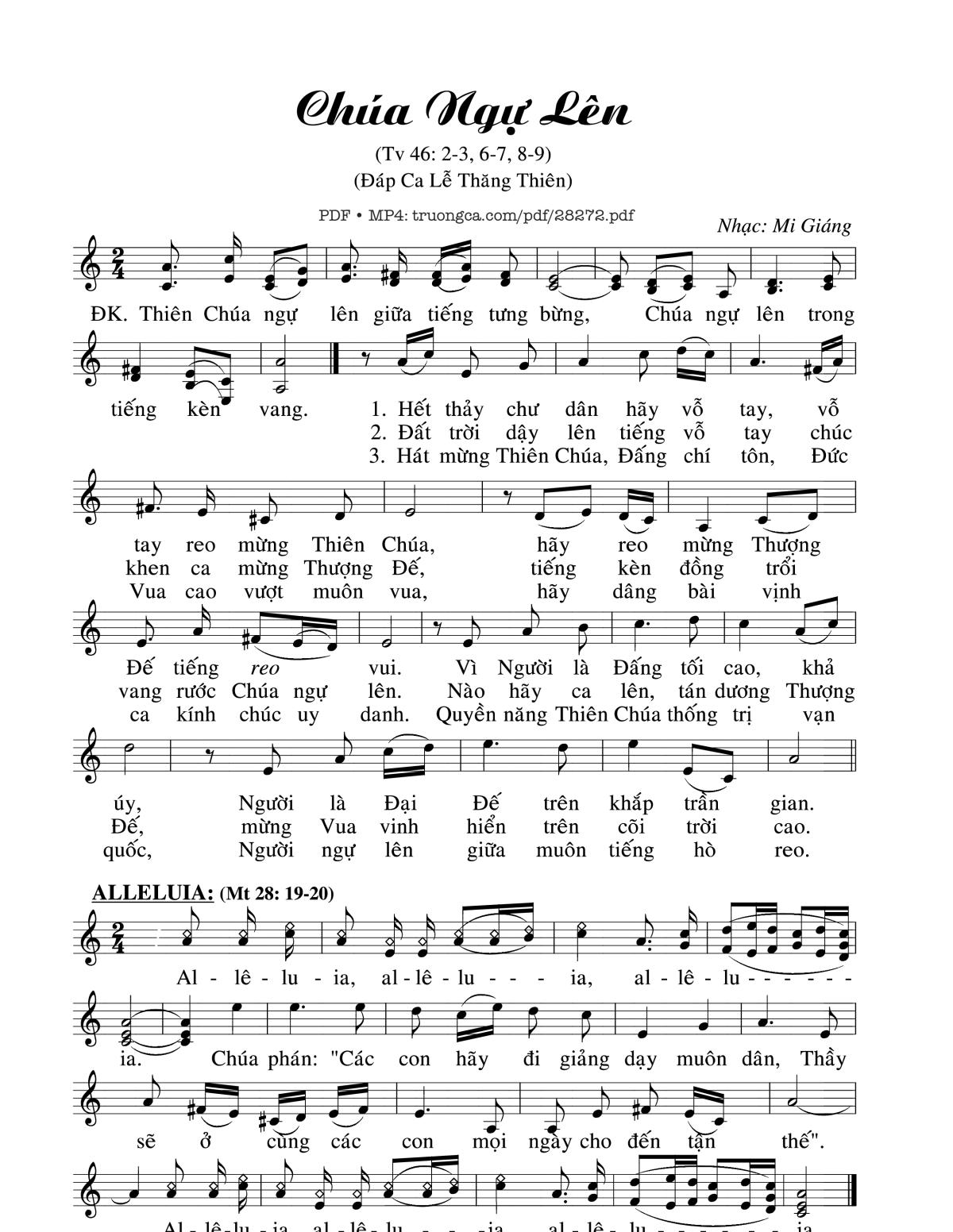 The Videos/audios Thánh Vịnh 46, Chúa Ngự Lên by Mi Giáng were embed from Youtube, Musescore or the other 3rd links. Videos are subject to 3rd's copyright control and may be removed by YouTube's copyright rules and 3rd's policies or maybe included advertisements. If you cannot access to these songs, this mean that have been removed.