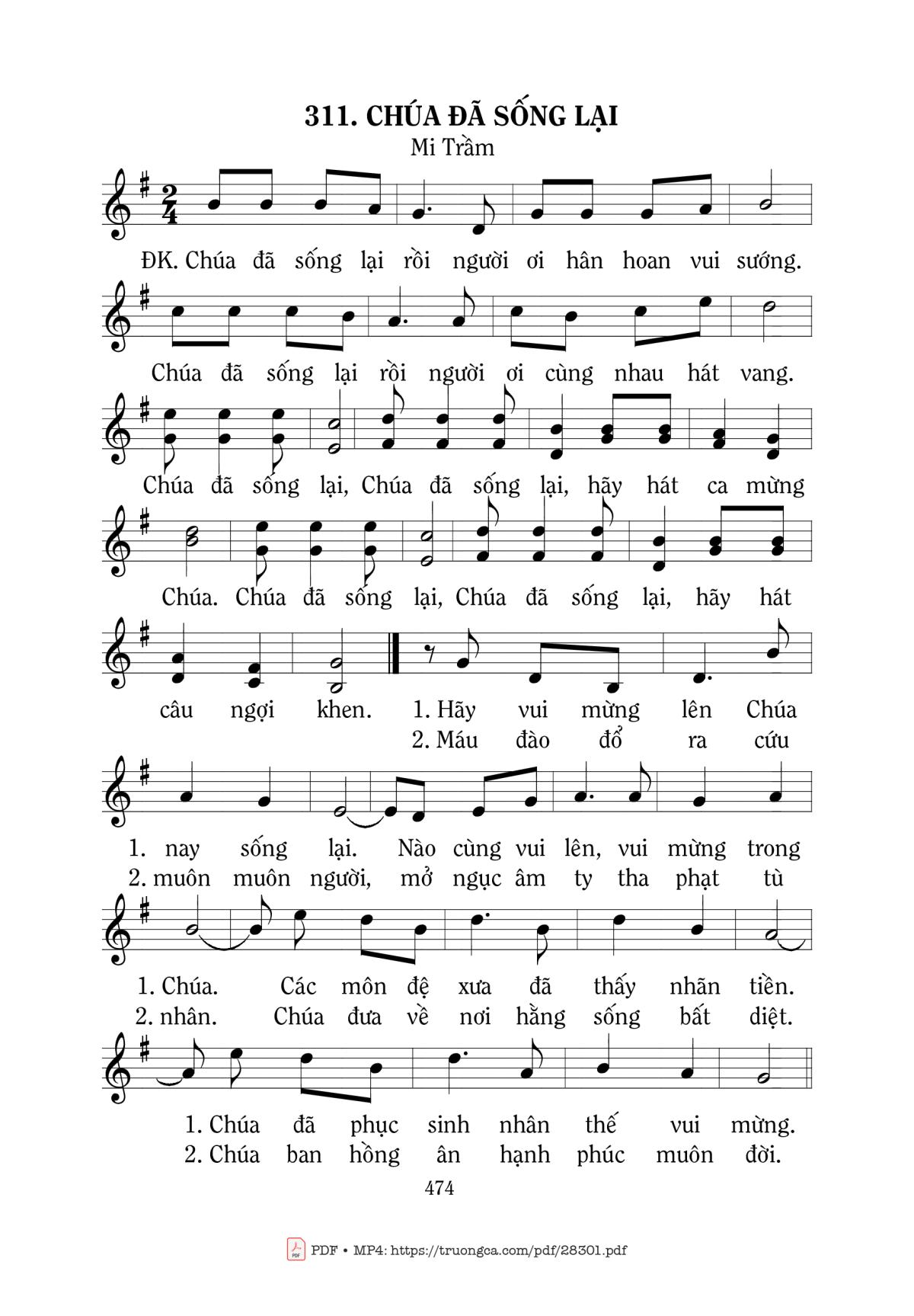 Điệp khúc. Chúa đã sống lại rồi, người ơi hân hoan vui sướng. Chúa đã sống lại rồi, người ơi cùng nhau hát vang. Chúa đã sống lại, Chúa đã sống lại, hãy hát ca mừng Chúa. Chúa đã sống lại, Chúa đã sống lại, hãy hát câu ngợi khen.