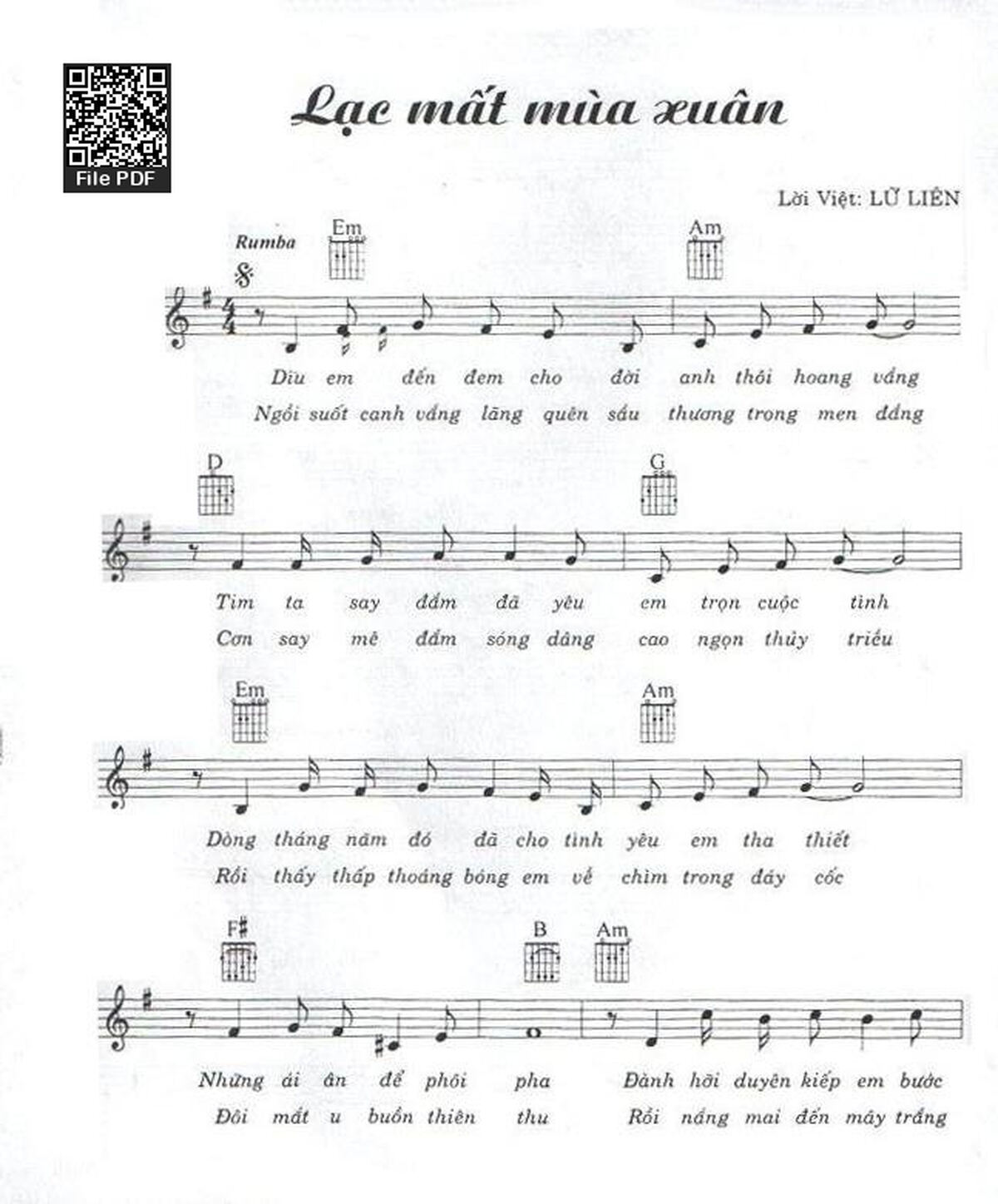 Sheet music Lạc Mất Mùa Xuân by Lữ Liên and PDF file was posted here to support you to practice singing perfectly. Sheets with notes and chords are for reference only, for non-commercial purposes only, not involved with earning money by buying and selling. Copyright is belong to song writer/author and copyright owner. Truongca.com do not own any copyrighted content. You can download the high-quality PDF files which contain staffs by PDF link above.