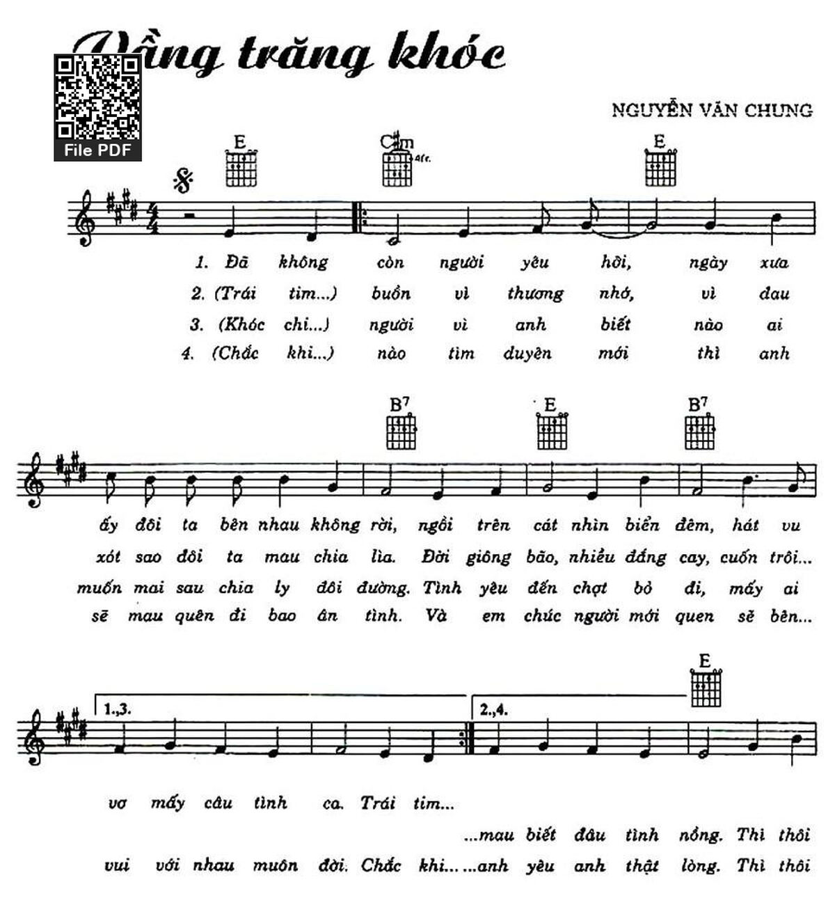 Sheet music Vầng Trăng Khóc by Chưa Chọn and PDF file was posted here to support you to practice singing perfectly. Sheets with notes and chords are for reference only, for non-commercial purposes only, not involved with earning money by buying and selling. Copyright is belong to song writer/author and copyright owner. Truongca.com do not own any copyrighted content. You can download the high-quality PDF files which contain staffs by PDF link above.