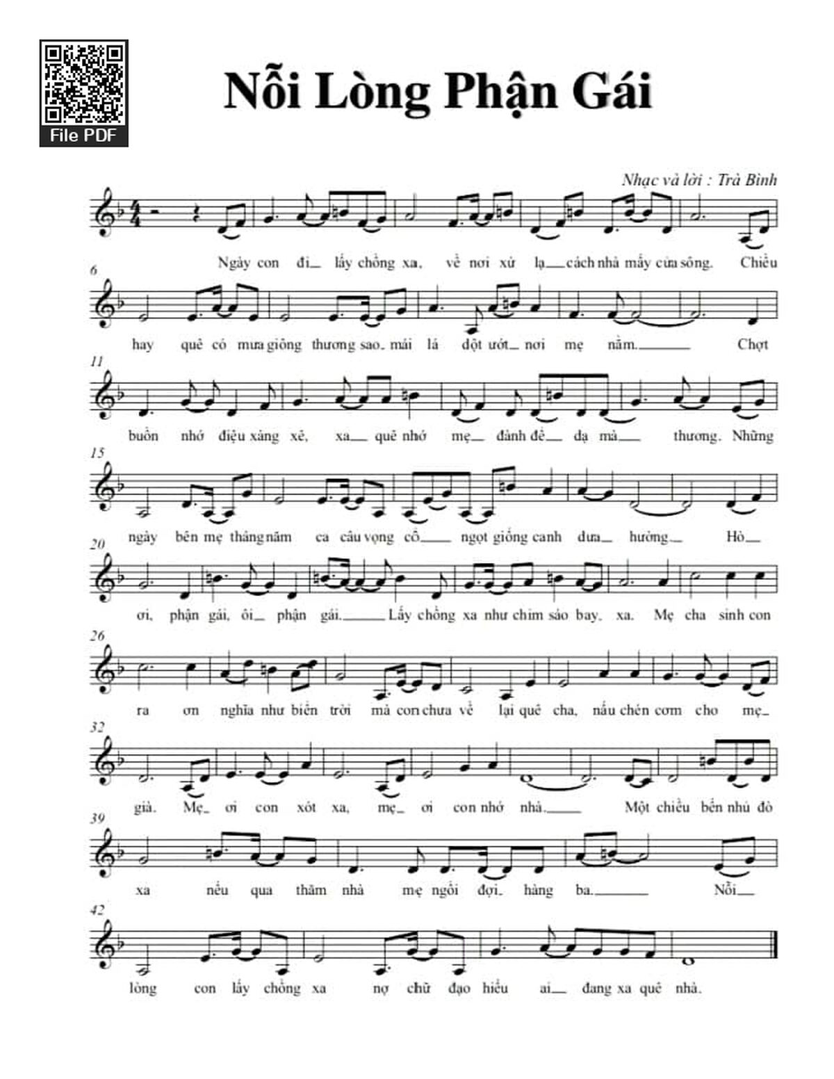 Trà Bình Ngày con đi lấy chồng xa Về nơi xứ lạ cách nhà mấy cửa sông [PDF] [Sheet] [Lyrics] [Mp4/Midi]