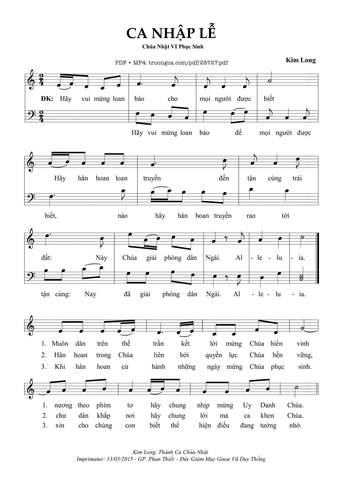 Điệp khúc. Hãy vui mừng loan báo cho mọi người được biết. Hãy hân hoan loan truyền đến tận cùng trái đất: Này Chúa giải phóng dân Ngài. Al-le-lu-ia.