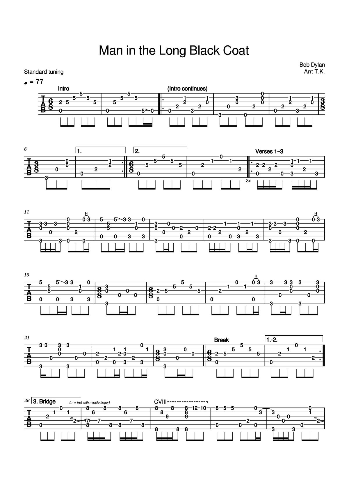 The Videos/audios Man in the Long Black Coat Guitar TAB by Bob Dylan were embed from Youtube, Musescore or the other 3rd links. Videos are subject to 3rd's copyright control and may be removed by YouTube's copyright rules and 3rd's policies or maybe included advertisements. If you cannot access to these videos/audios, this mean that have been removed.