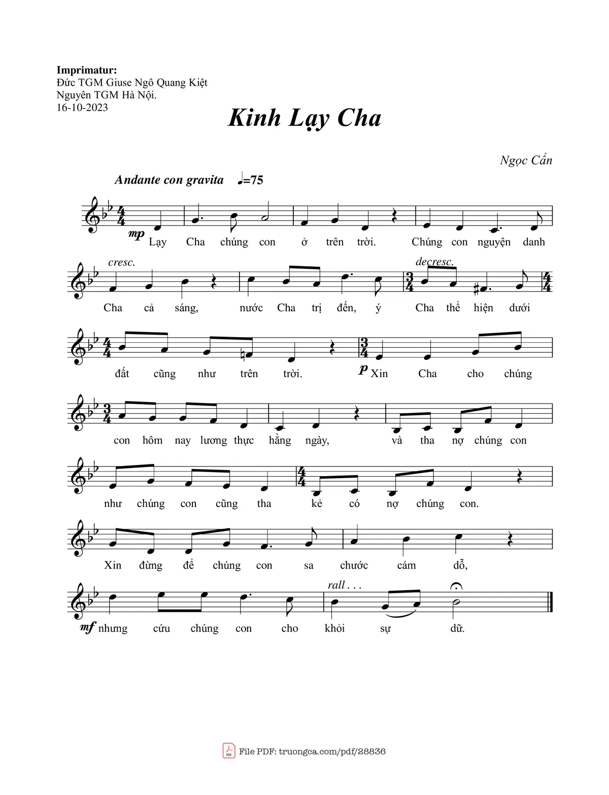 Transposition is the process of moving a song's melody and chords up or down in pitch by a constant interval. The direction of the transposition tool is indicated by a plus (+) sign for up and a minus (-) sign for down. Hover mouse over chords signs to see the chords chart of Kinh Lạy Cha song.