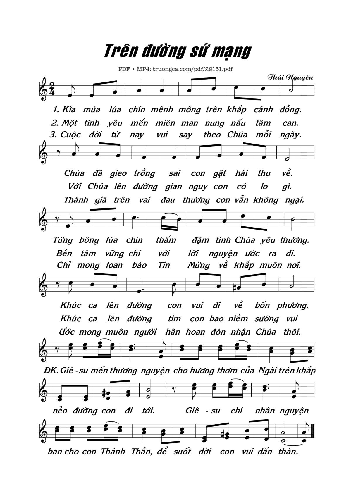 The Videos/audios Trên Đường Sứ Mạng by Thái Nguyên were embed from Youtube, Musescore or the other 3rd links. Videos are subject to 3rd's copyright control and may be removed by YouTube's copyright rules and 3rd's policies or maybe included advertisements. If you cannot access to these songs, this mean that have been removed.