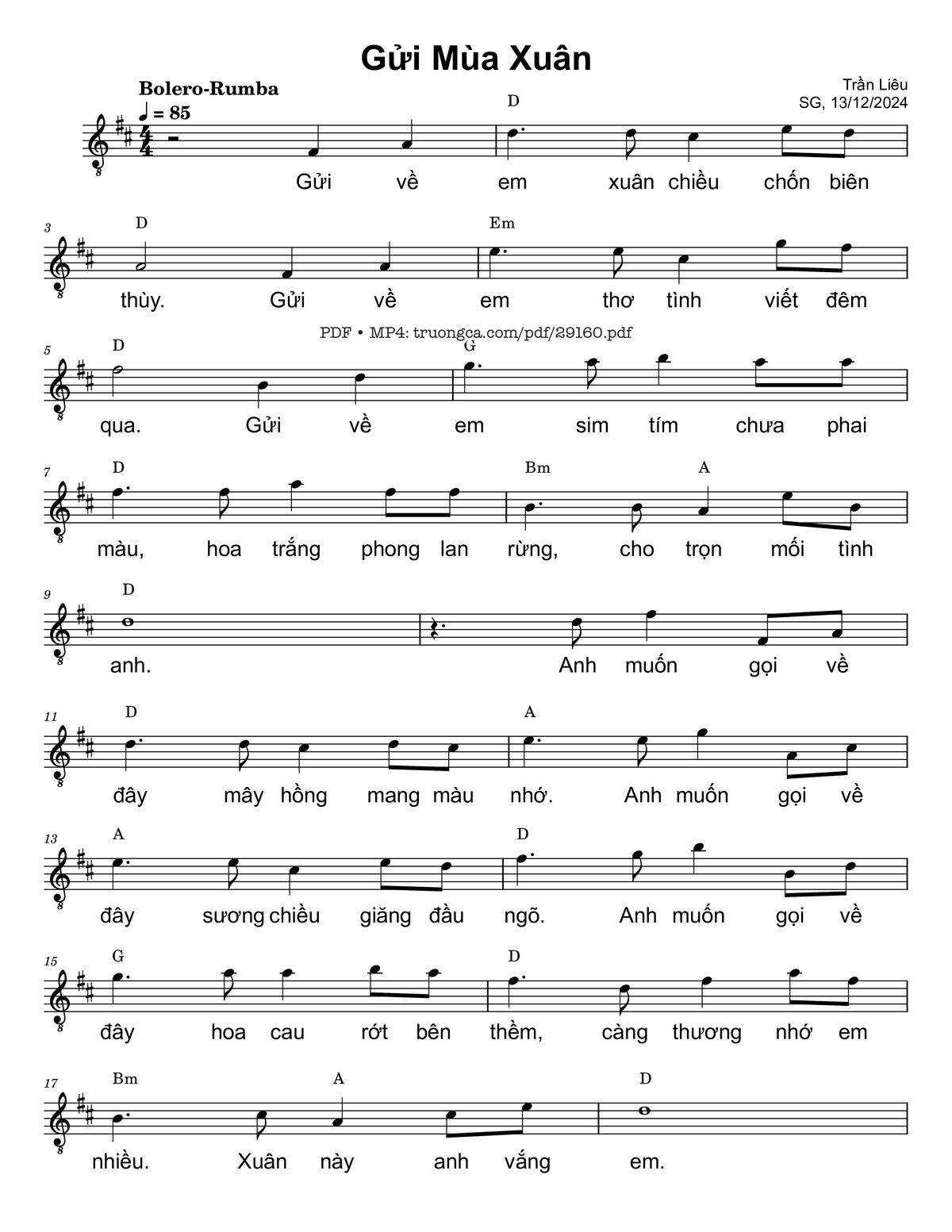 Trần Liêu Gửi về em xuân chiều chốn biên thùy Gửi về em thơ tình viết đêm qua [PDF] [Sheet] [Lyrics] [Mp4/Midi]