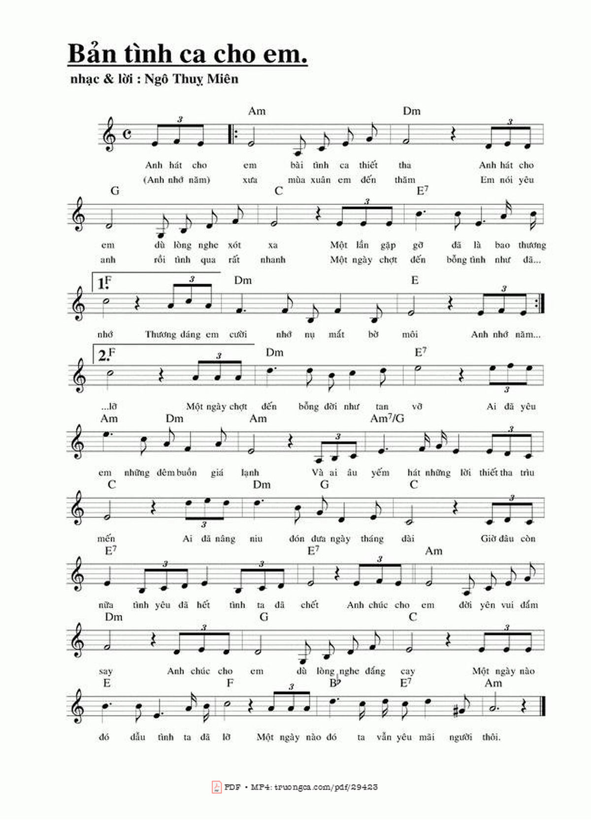 Sheet music Bản Tình Ca Cho Em by Ngô Thụy Miên and PDF file was posted here to support you to practice singing perfectly. Sheets with notes and chords are for reference only, for non-commercial purposes only, not involved with earning money by buying and selling. Copyright is belong to song writer/author and copyright owner. Truongca.com do not own any copyrighted content. You can download the high-quality PDF files which contain staffs by PDF link above.