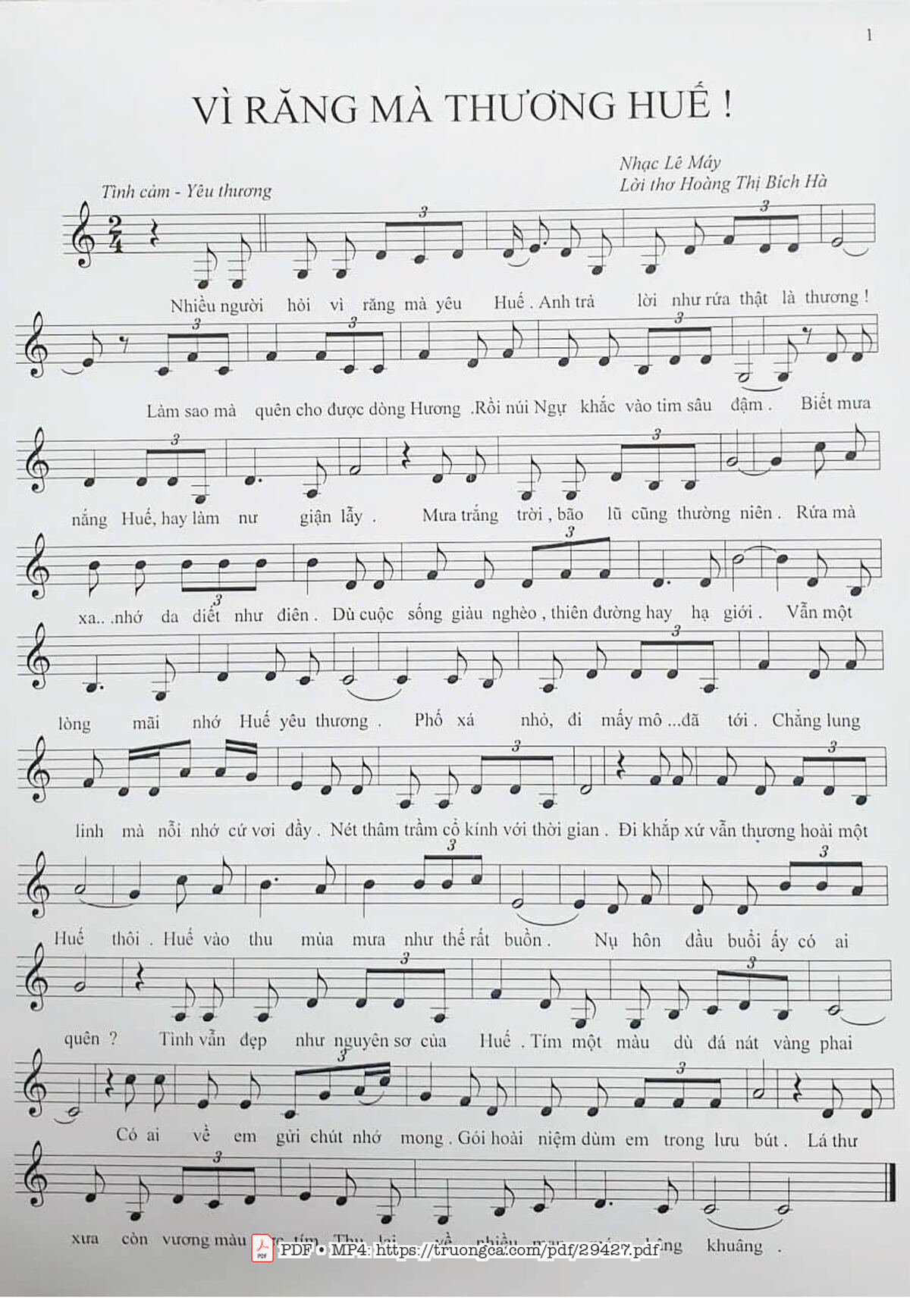 Lê Máy Nhiều người hỏi vì răng mà yêu Huế Anh trả lời như rứa thật là thương [PDF] [Sheet] [Lyrics] [Mp4/Midi]