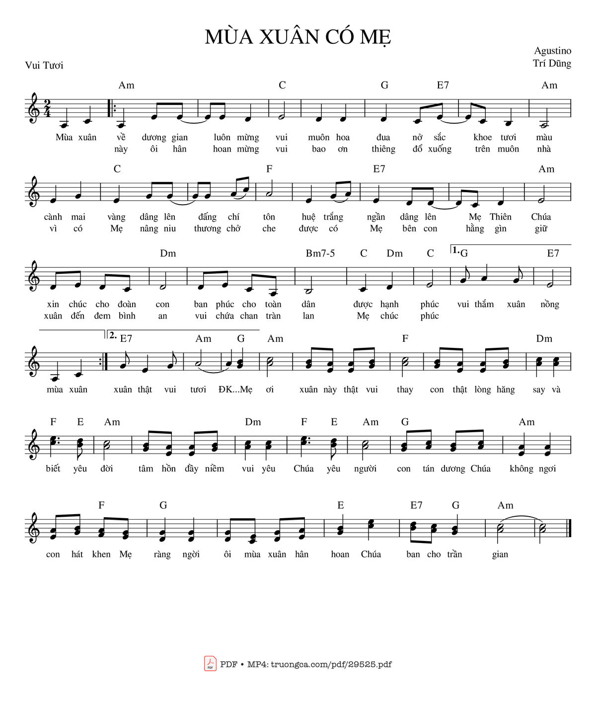 Transposition is the process of moving a song's melody and chords up or down in pitch by a constant interval. The direction of the transposition tool is indicated by a plus (+) sign for up and a minus (-) sign for down. Hover mouse over chords signs to see the chords chart of Mùa xuân có Mẹ song.