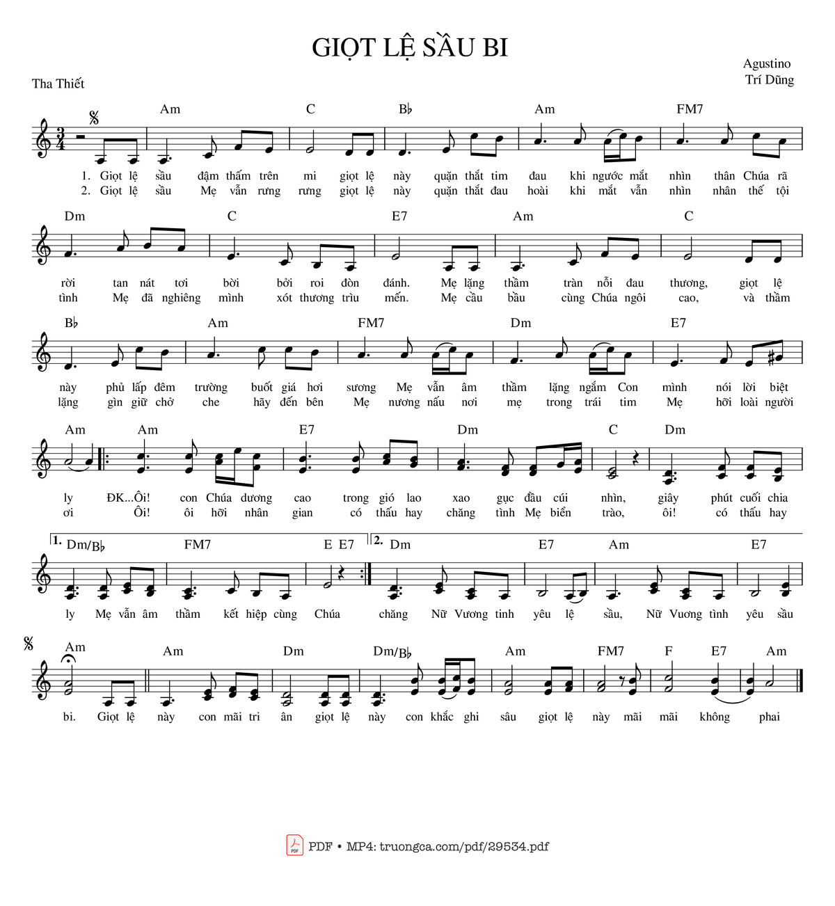 Transposition is the process of moving a song's melody and chords up or down in pitch by a constant interval. The direction of the transposition tool is indicated by a plus (+) sign for up and a minus (-) sign for down. Hover mouse over chords signs to see the chords chart of Giọt lệ sầu bi song.