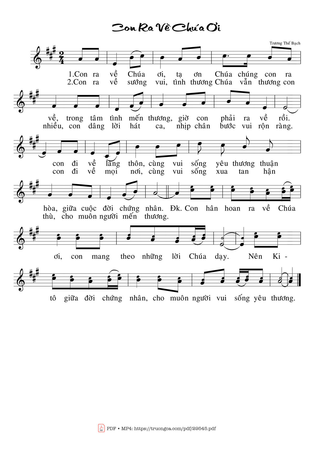 2- Con ra về sướng vui, tình thương Chúa vẫn thương con nhiều, con dâng lời hát ca, nhịp chân bước vui rộn ràng. Con đi về mọi nơi, cùng vui sống xua tan hận thù, cho muôn người mến thương.
