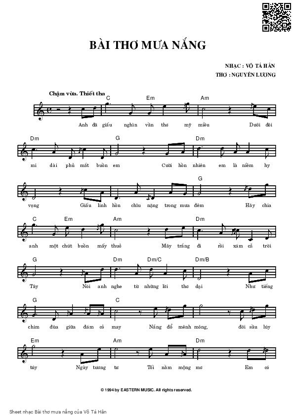 Transposition is the process of moving a song's melody and chords up or down in pitch by a constant interval. The direction of the transposition tool is indicated by a plus (+) sign for up and a minus (-) sign for down. Hover mouse over chords signs to see the chords chart of Bài thơ mưa nắng song.