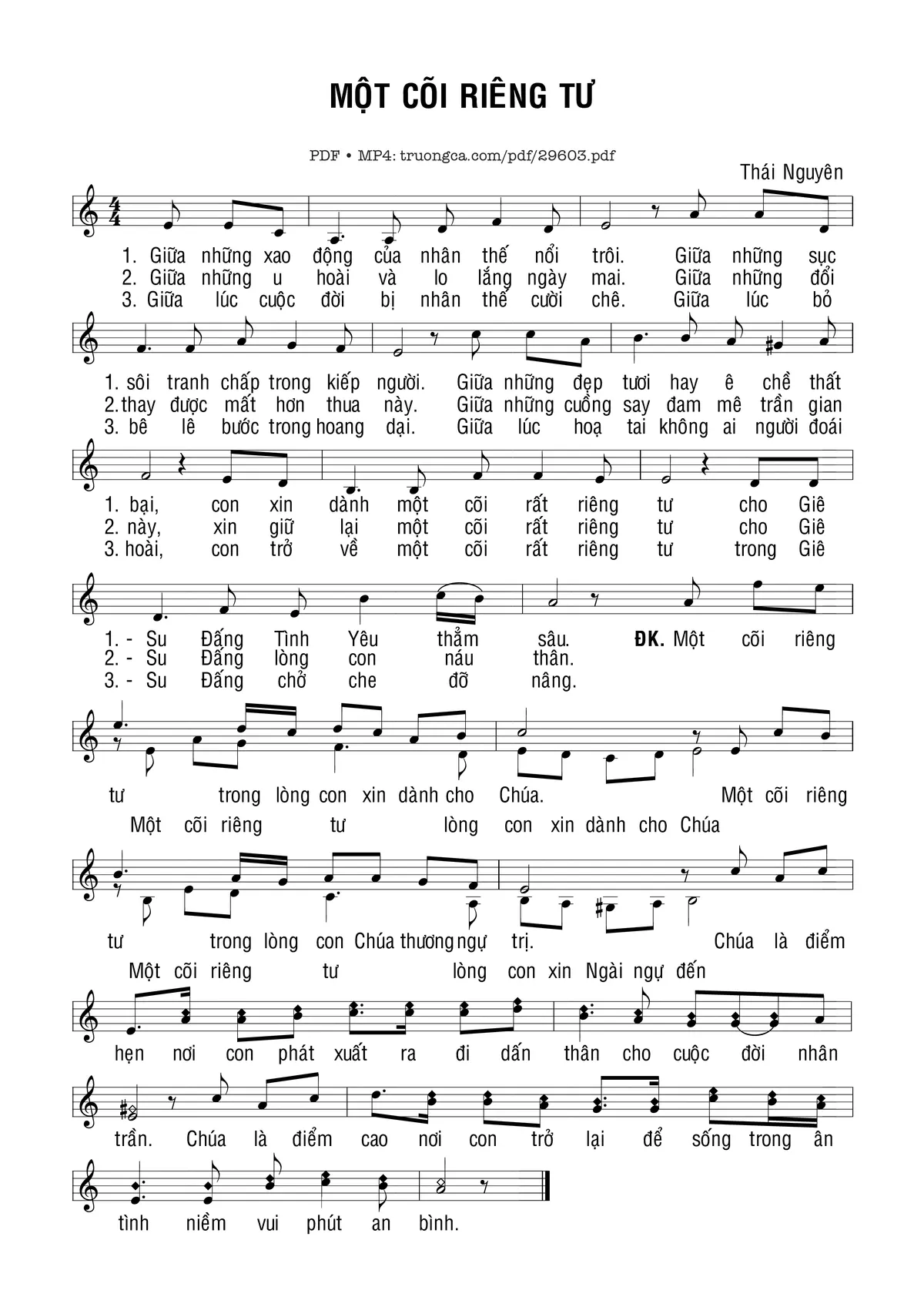 Điệp khúc. Một cõi riêng tư trong lòng con xin dành cho Chúa. Một cõi riêng tư trong lòng con Chúa thương ngự trị. Chúa là điểm hẹn nơi con phát xuất ra đi dấn thân cho cuộc đời