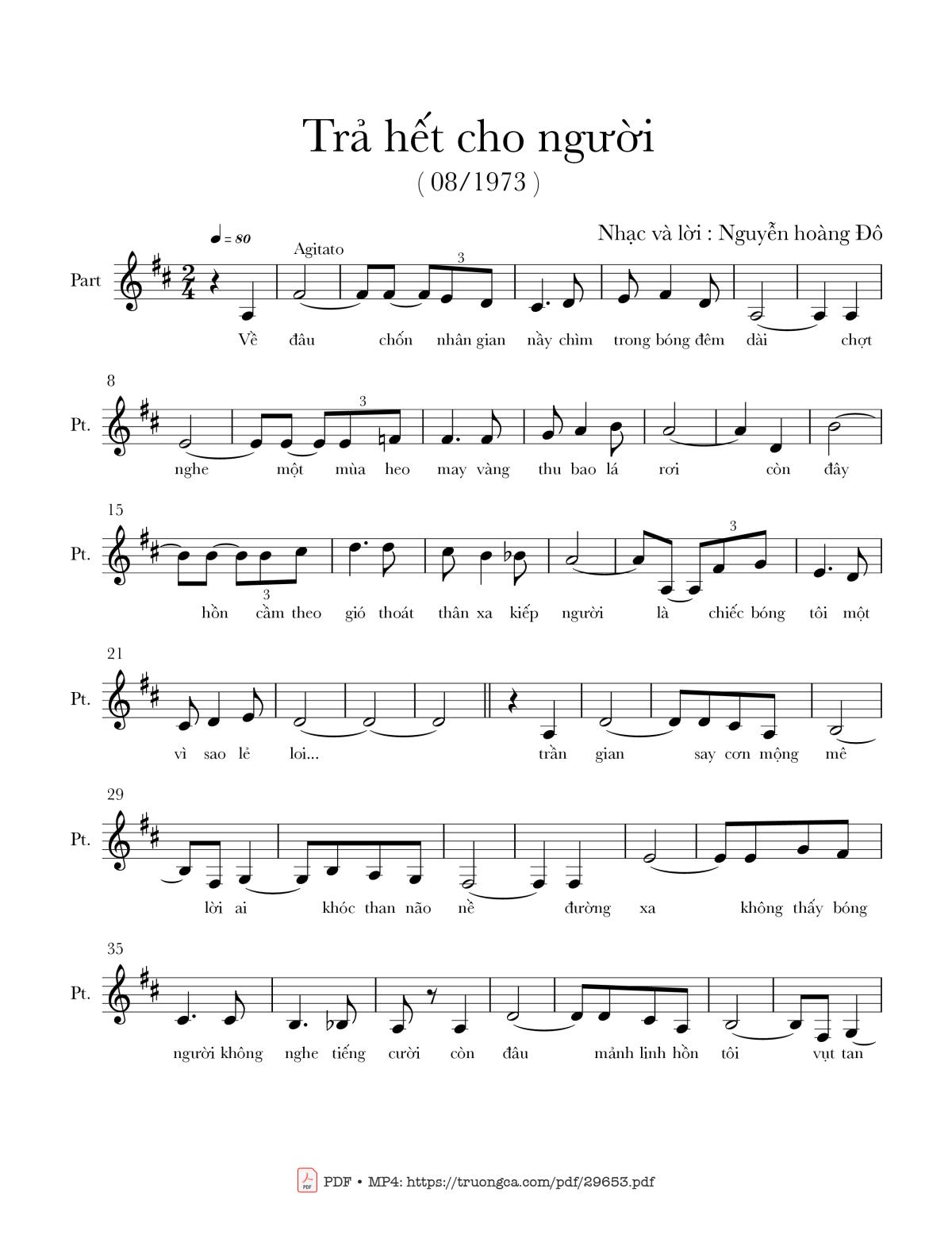 The Videos/audios Trả hết cho người by Nguyễn Hoàng Đô were embed from Youtube, Musescore or the other 3rd links. Videos are subject to 3rd's copyright control and may be removed by YouTube's copyright rules and 3rd's policies or maybe included advertisements. If you cannot access to these songs, this mean that have been removed.