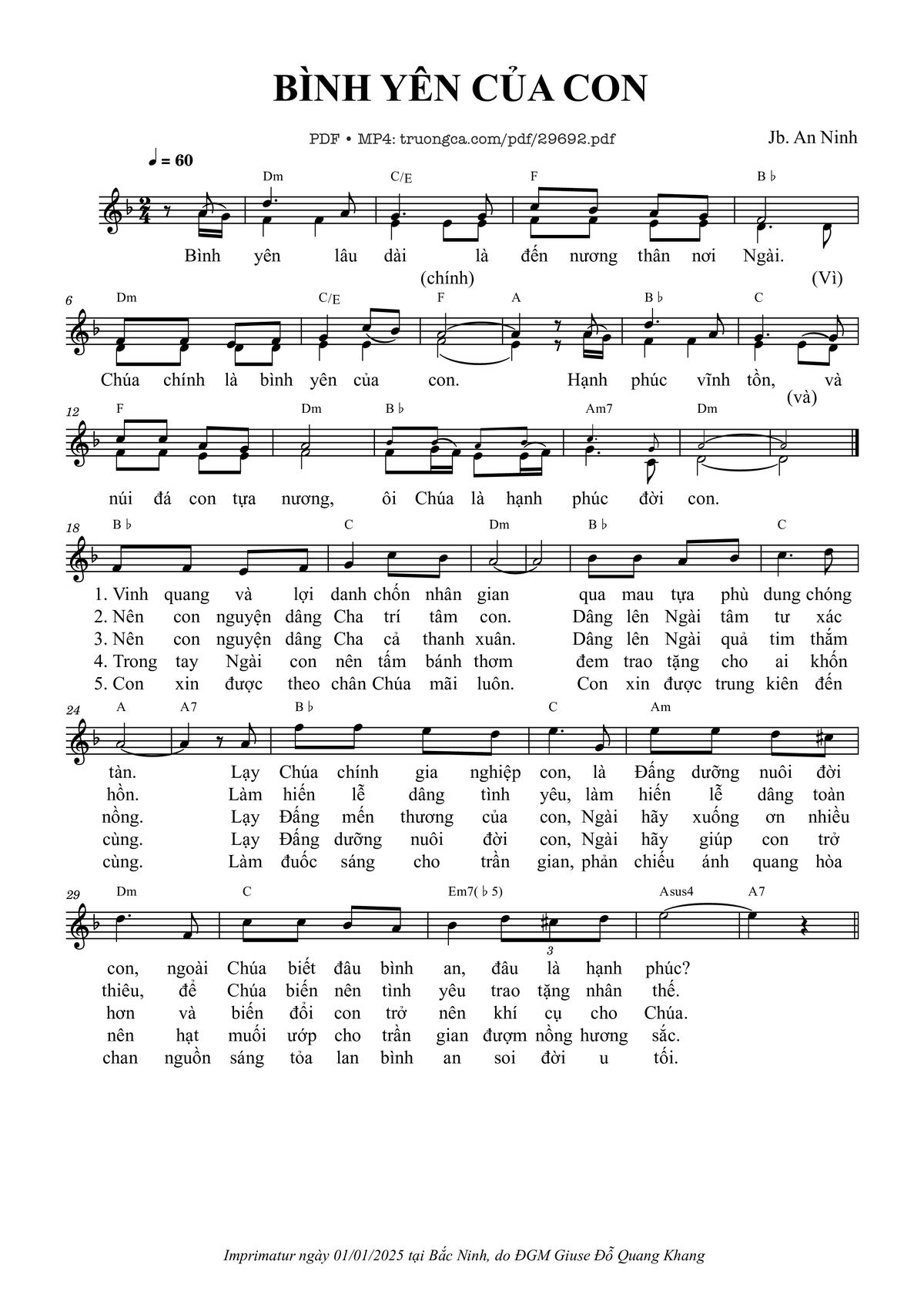 Sheet music Bình yên của con by Jb. An Ninh and PDF file was posted here to support you to practice singing perfectly. Sheets with notes and chords are for reference only, for non-commercial purposes only, not involved with earning money by buying and selling. Copyright is belong to song writer/author and copyright owner. Truongca.com do not own any copyrighted content. You can download the high-quality PDF files which contain staffs by PDF link above.
