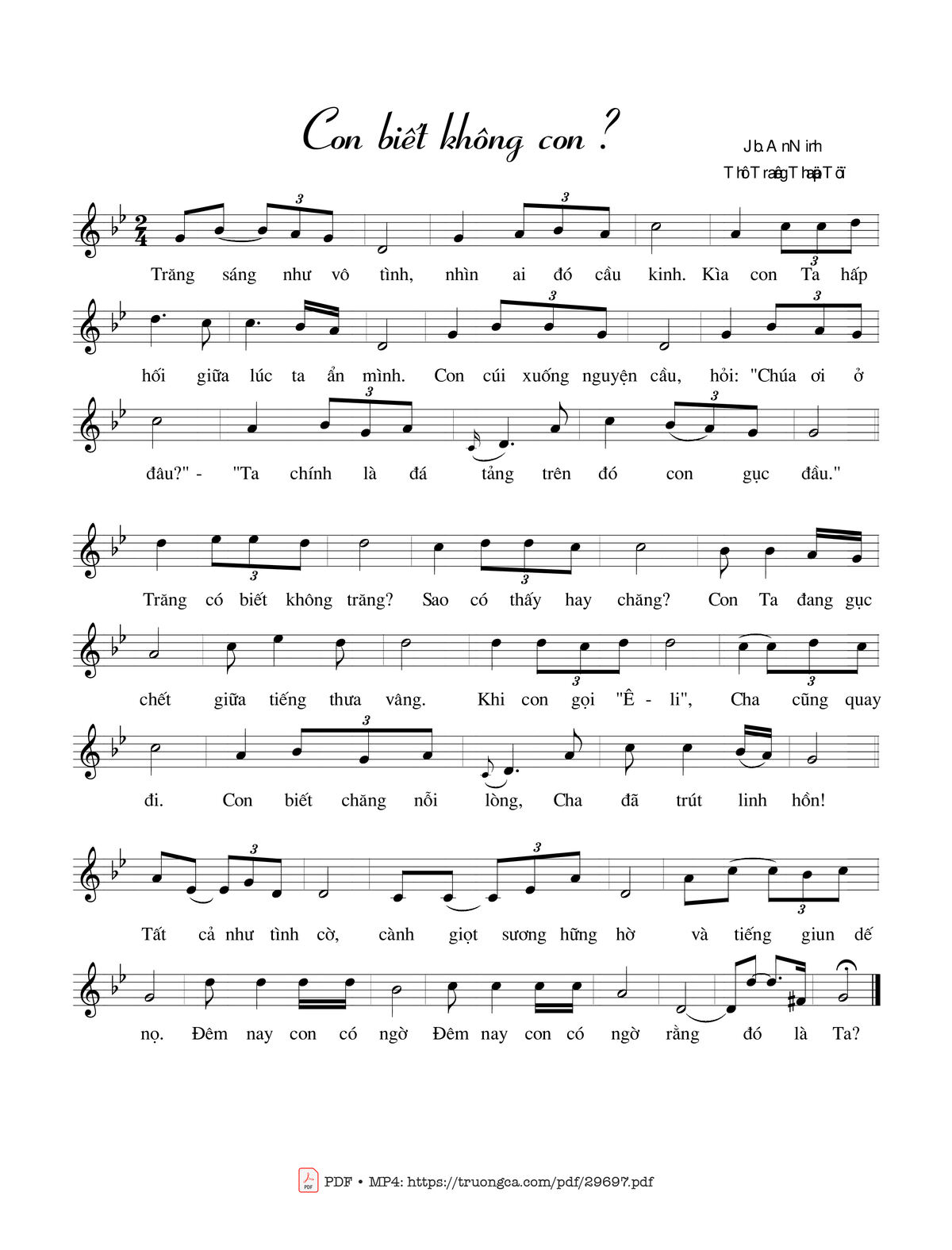 Sheet music Con biết không con ? by Jb. An Ninh and PDF file was posted here to support you to practice singing perfectly. Sheets with notes and chords are for reference only, for non-commercial purposes only, not involved with earning money by buying and selling. Copyright is belong to song writer/author and copyright owner. Truongca.com do not own any copyrighted content. You can download the high-quality PDF files which contain staffs by PDF link above.
