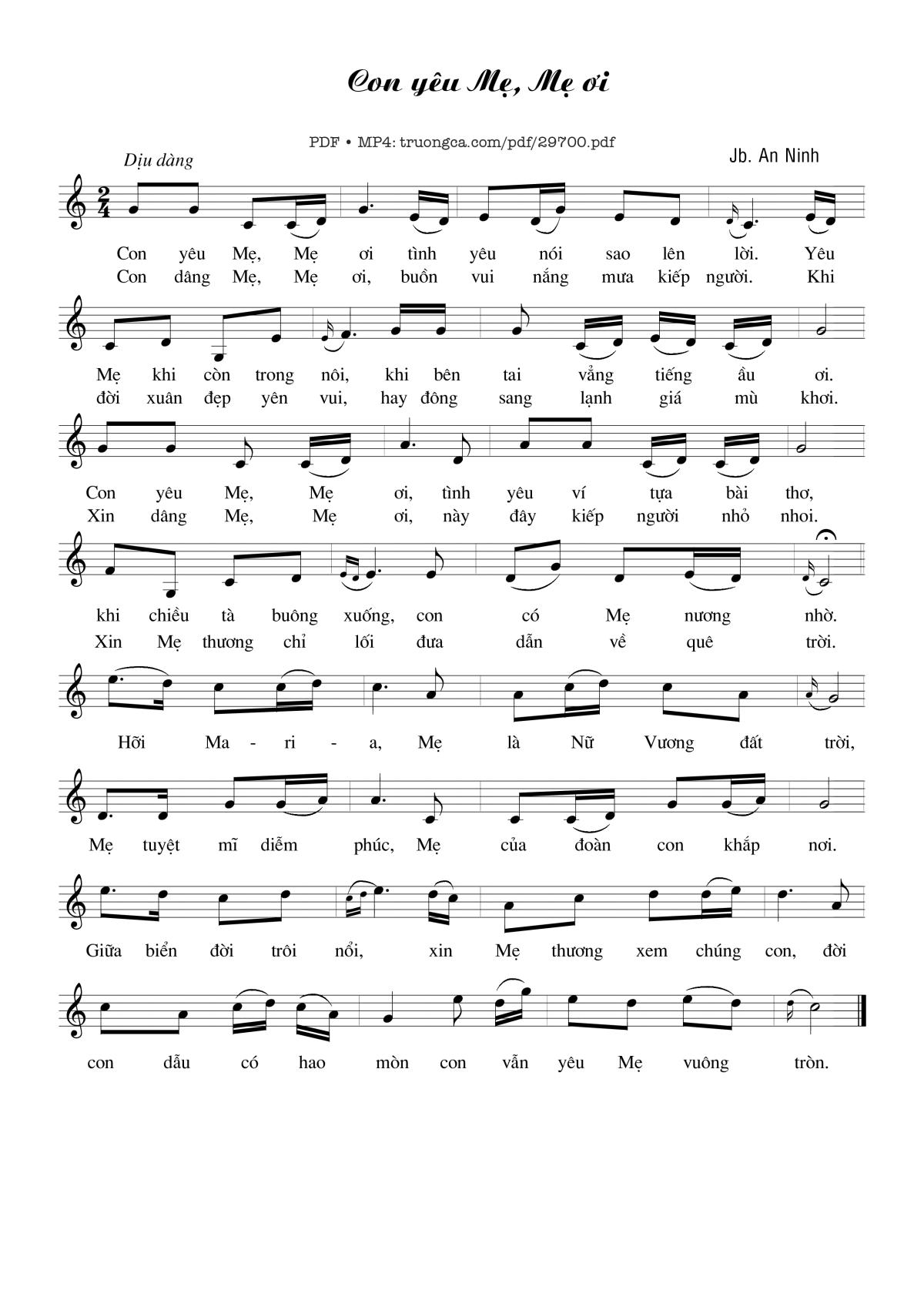 Transposition is the process of moving a song's melody and chords up or down in pitch by a constant interval. The direction of the transposition tool is indicated by a plus (+) sign for up and a minus (-) sign for down. Hover mouse over chords signs to see the chords chart of Con yêu Mẹ Mẹ ơi song.