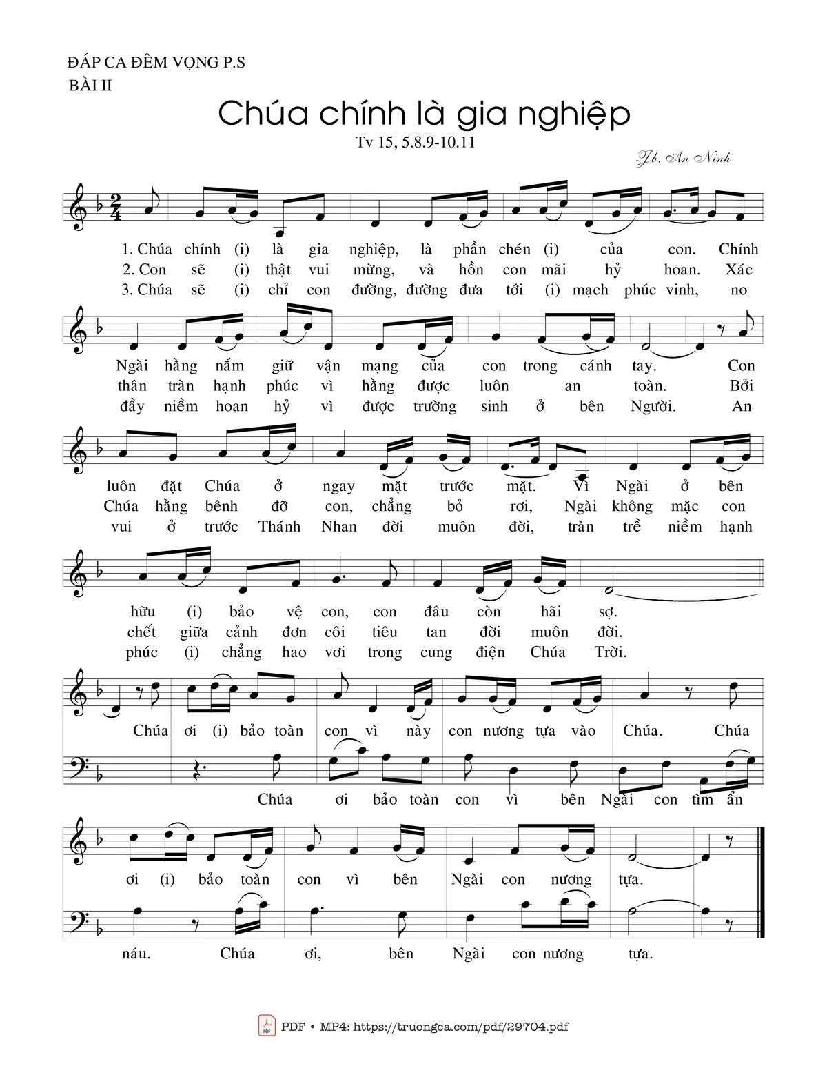Sheet music Chúa chính là gia nghiệp (Tv. 15) by Jb. An Ninh and PDF file was posted here to support you to practice singing perfectly. Sheets with notes and chords are for reference only, for non-commercial purposes only, not involved with earning money by buying and selling. Copyright is belong to song writer/author and copyright owner. Truongca.com do not own any copyrighted content. You can download the high-quality PDF files which contain staffs by PDF link above.