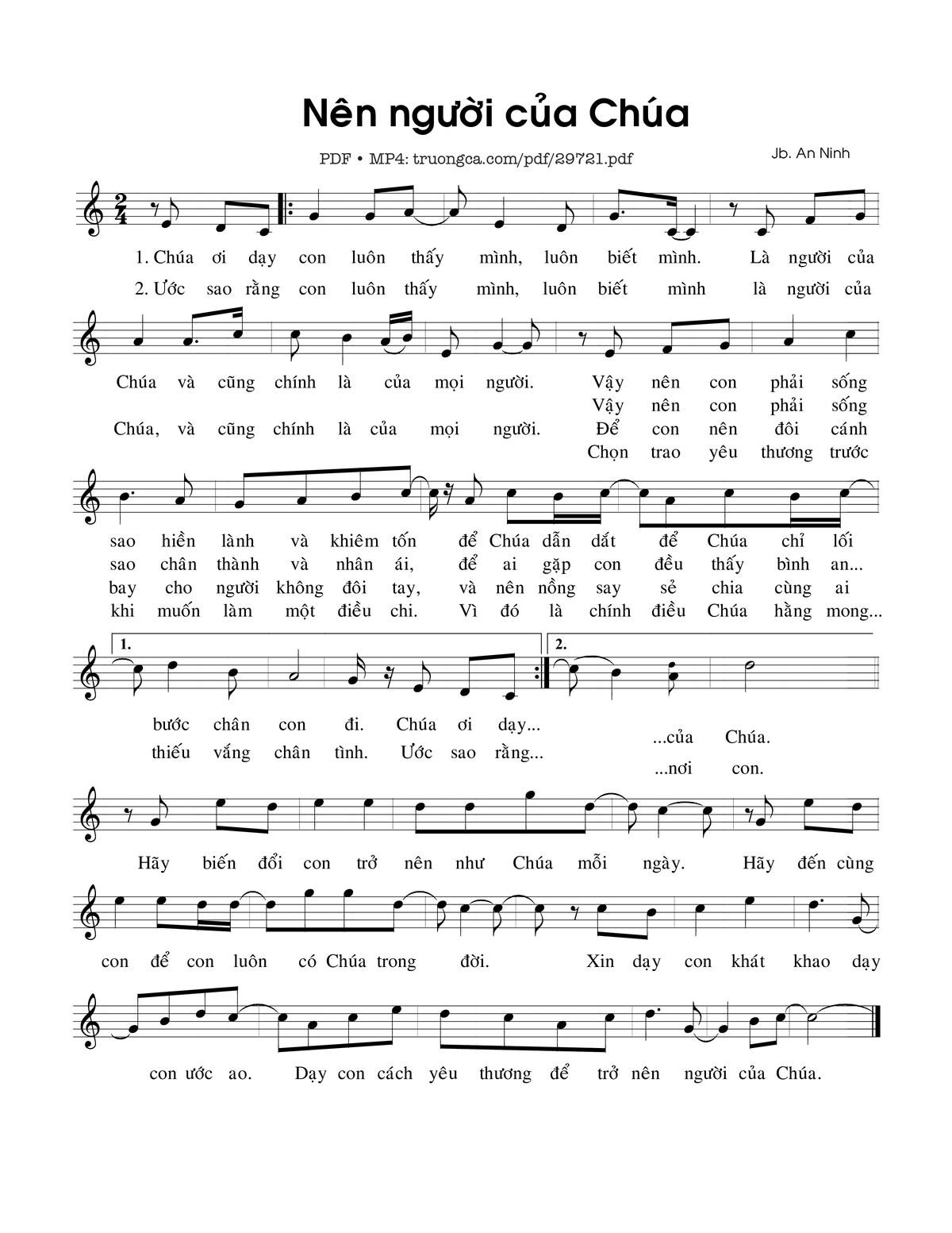 Sheet music Nên người của Chúa by Jb. An Ninh and PDF file was posted here to support you to practice singing perfectly. Sheets with notes and chords are for reference only, for non-commercial purposes only, not involved with earning money by buying and selling. Copyright is belong to song writer/author and copyright owner. Truongca.com do not own any copyrighted content. You can download the high-quality PDF files which contain staffs by PDF link above.