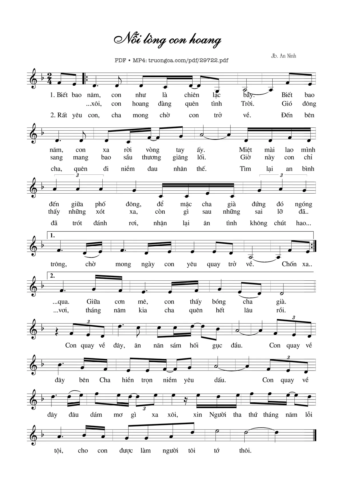 Sheet music Nỗi lòng con hoang (Lc. 15) by Jb. An Ninh and PDF file was posted here to support you to practice singing perfectly. Sheets with notes and chords are for reference only, for non-commercial purposes only, not involved with earning money by buying and selling. Copyright is belong to song writer/author and copyright owner. Truongca.com do not own any copyrighted content. You can download the high-quality PDF files which contain staffs by PDF link above.