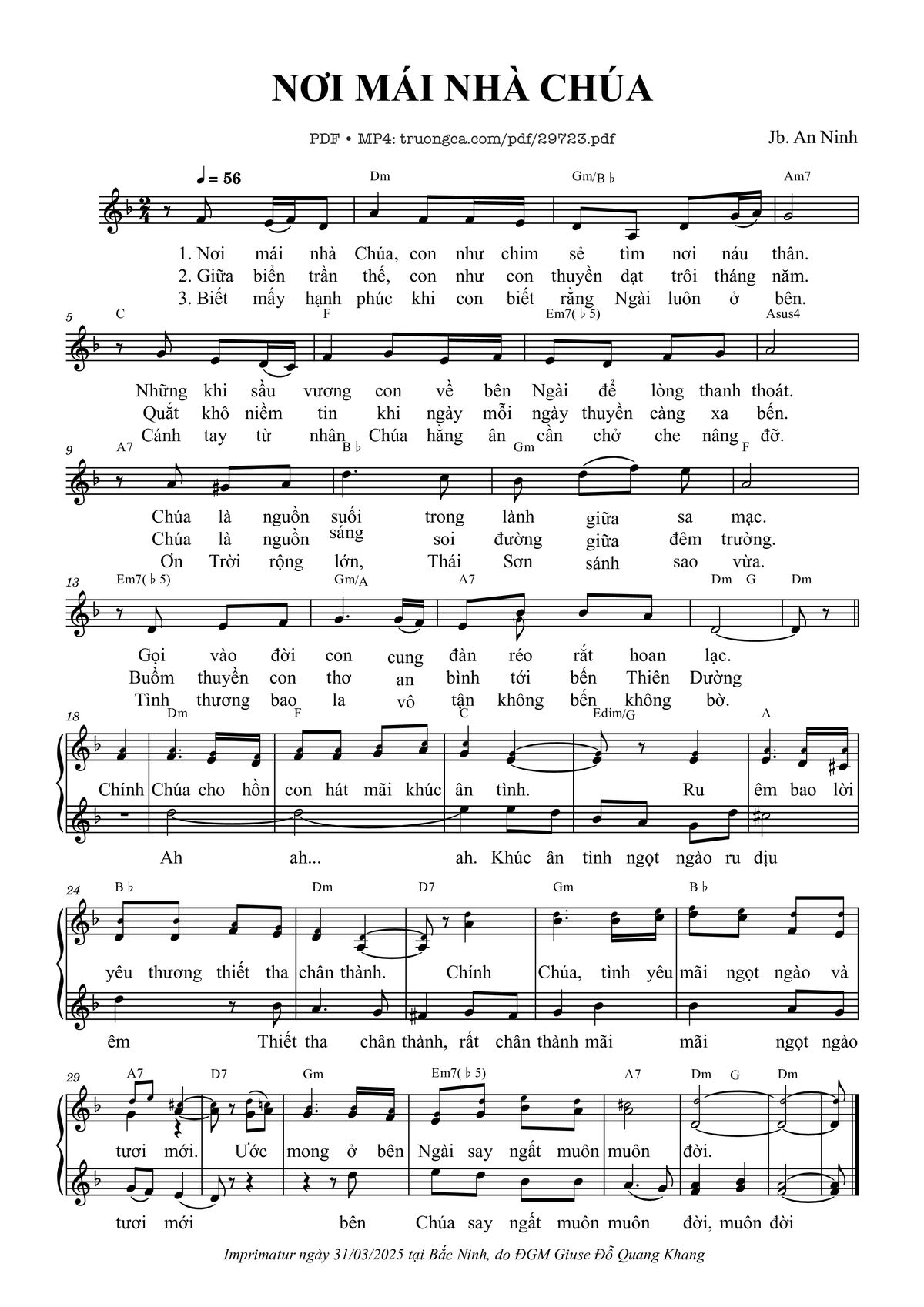 Sheet music Nơi mái nhà Chúa by Jb. An Ninh and PDF file was posted here to support you to practice singing perfectly. Sheets with notes and chords are for reference only, for non-commercial purposes only, not involved with earning money by buying and selling. Copyright is belong to song writer/author and copyright owner. Truongca.com do not own any copyrighted content. You can download the high-quality PDF files which contain staffs by PDF link above.