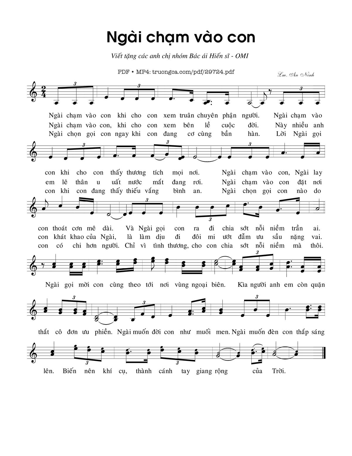 Sheet music Ngài chạm vào con by Jb. An Ninh and PDF file was posted here to support you to practice singing perfectly. Sheets with notes and chords are for reference only, for non-commercial purposes only, not involved with earning money by buying and selling. Copyright is belong to song writer/author and copyright owner. Truongca.com do not own any copyrighted content. You can download the high-quality PDF files which contain staffs by PDF link above.