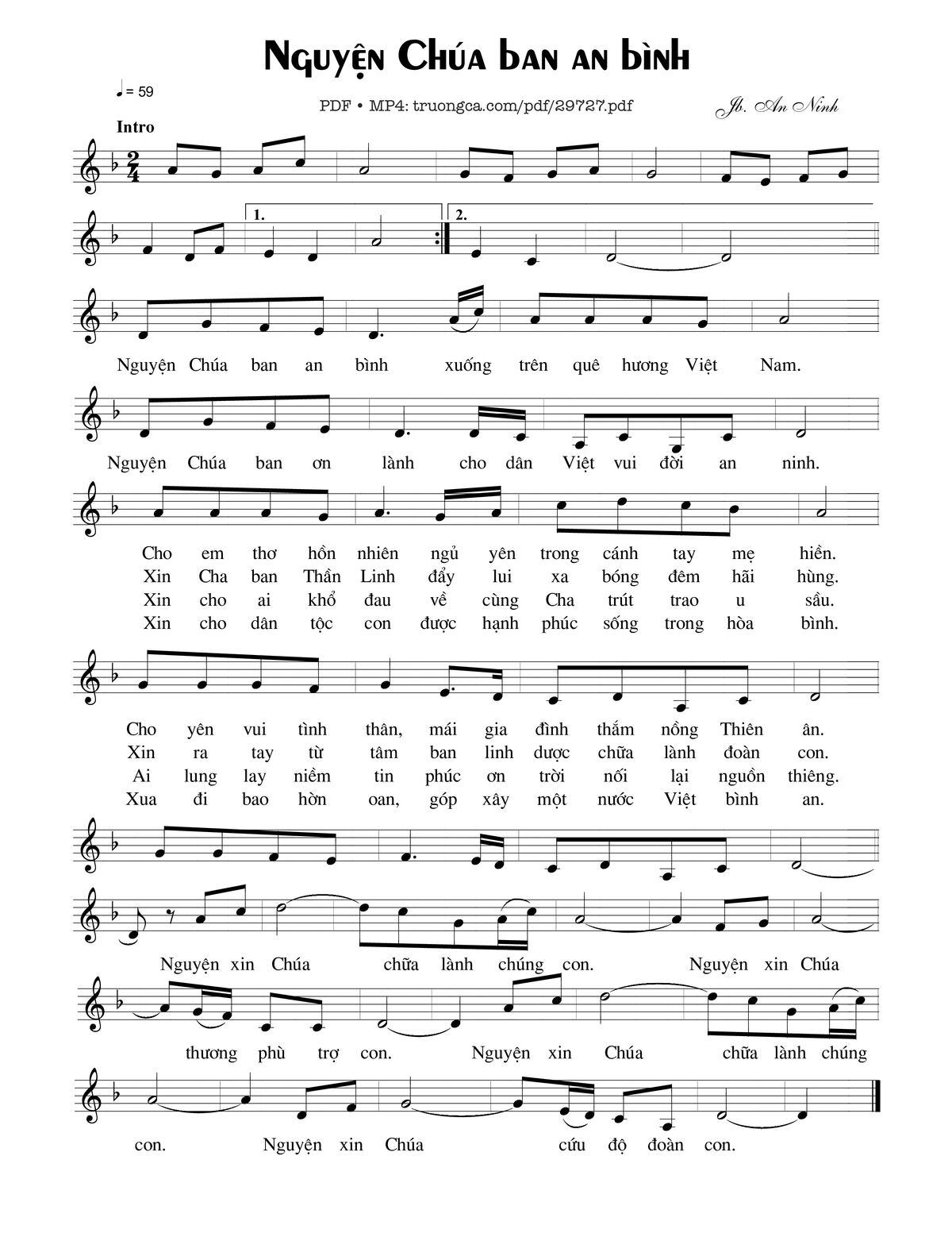 Sheet music Nguyện Chúa ban an bình by Jb. An Ninh and PDF file was posted here to support you to practice singing perfectly. Sheets with notes and chords are for reference only, for non-commercial purposes only, not involved with earning money by buying and selling. Copyright is belong to song writer/author and copyright owner. Truongca.com do not own any copyrighted content. You can download the high-quality PDF files which contain staffs by PDF link above.