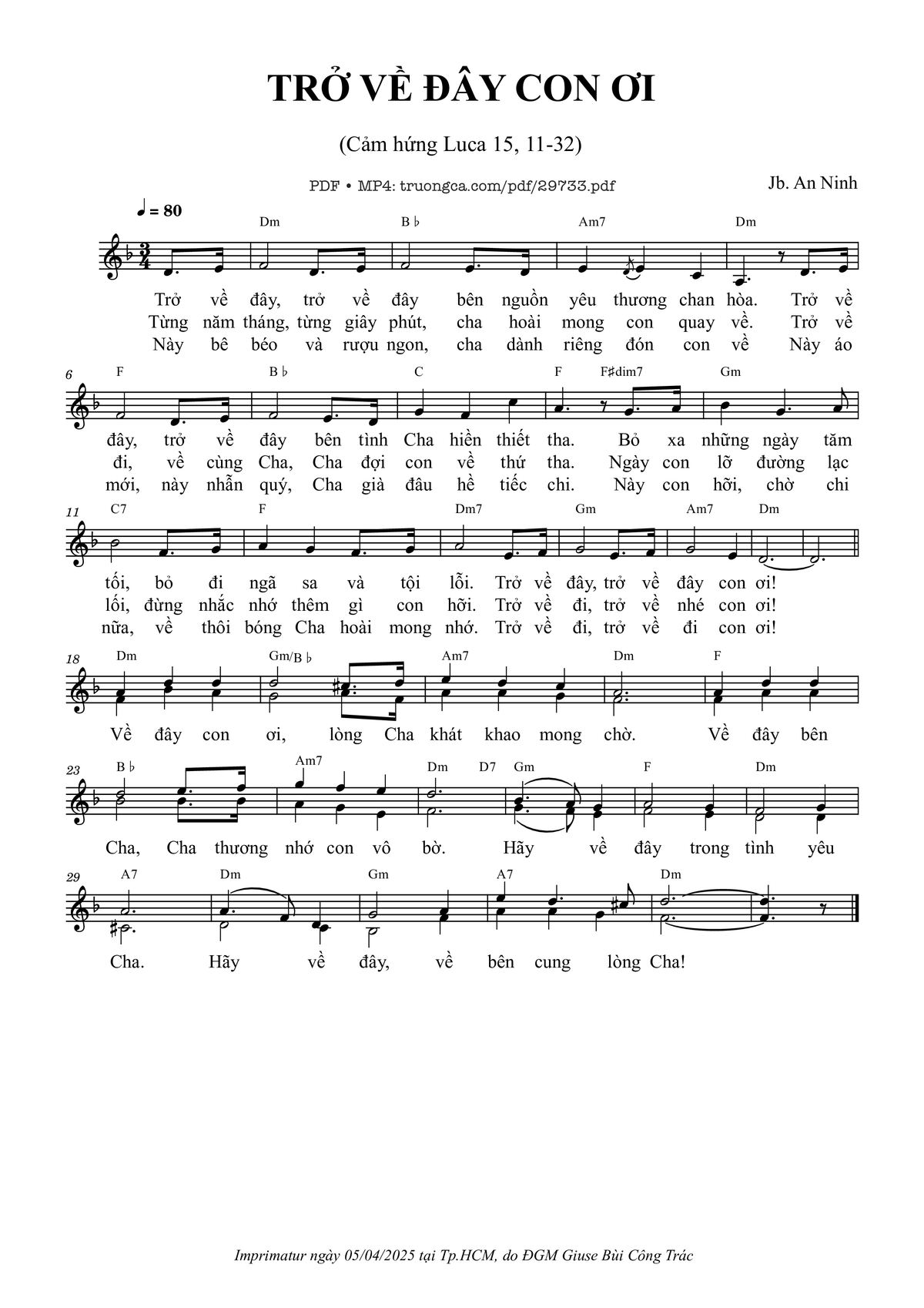 Transposition is the process of moving a song's melody and chords up or down in pitch by a constant interval. The direction of the transposition tool is indicated by a plus (+) sign for up and a minus (-) sign for down. Hover mouse over chords signs to see the chords chart of Trở về đây con ơi song.