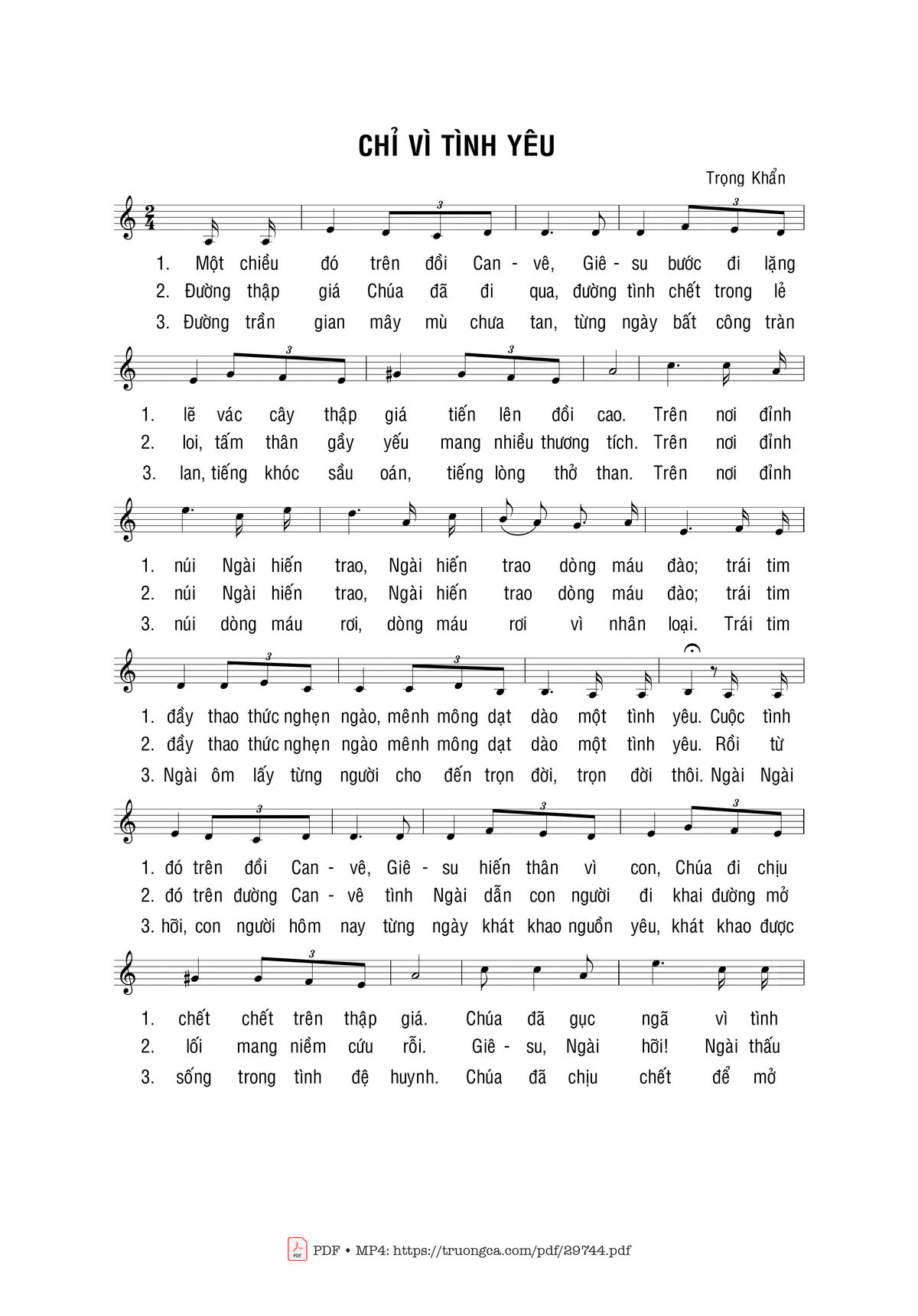 Sheet music Chỉ vì tình yêu by Trọng Khẩn and PDF file was posted here to support you to practice singing perfectly. Sheets with notes and chords are for reference only, for non-commercial purposes only, not involved with earning money by buying and selling. Copyright is belong to song writer/author and copyright owner. Truongca.com do not own any copyrighted content. You can download the high-quality PDF files which contain staffs by PDF link above.
