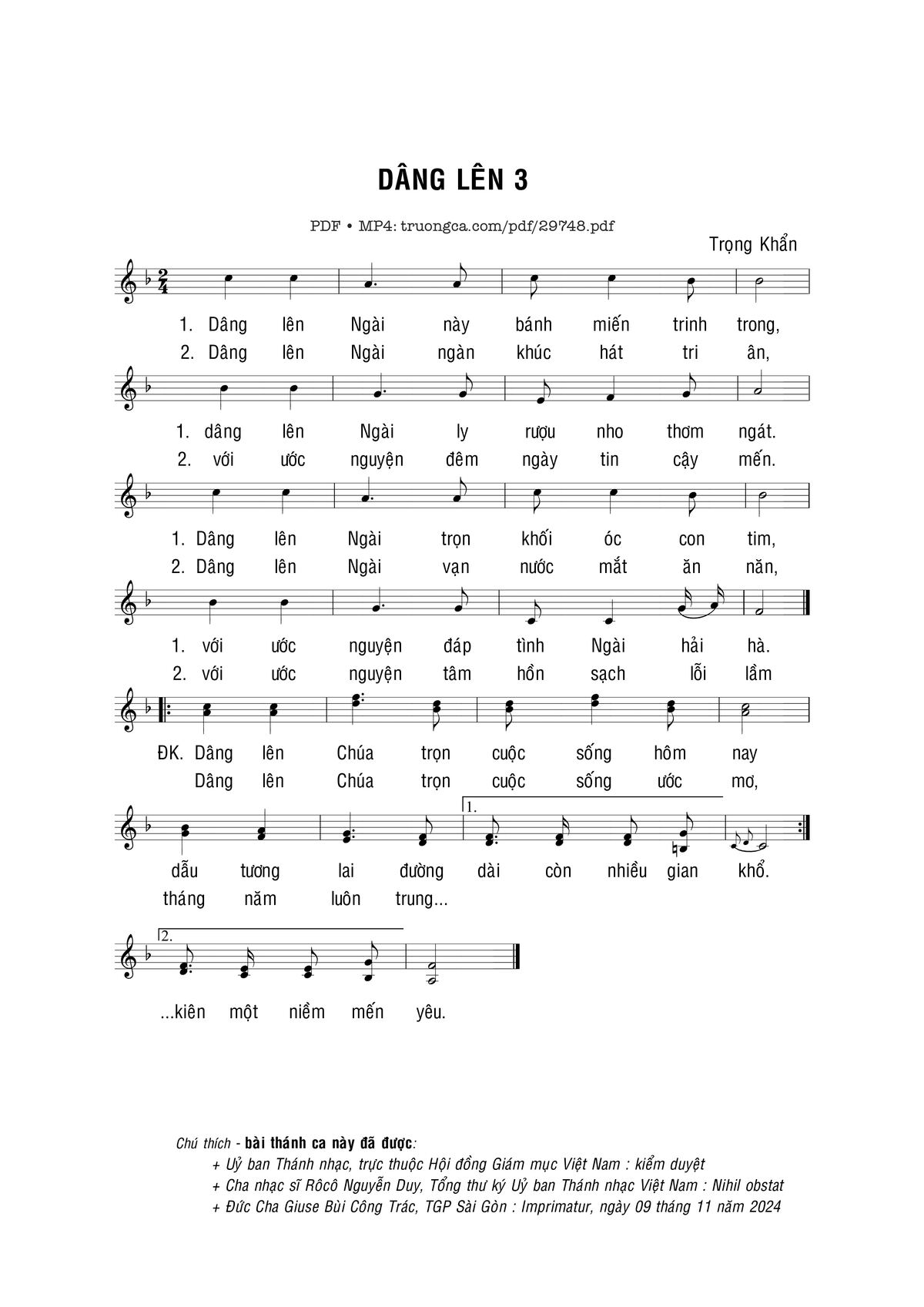 Transposition is the process of moving a song's melody and chords up or down in pitch by a constant interval. The direction of the transposition tool is indicated by a plus (+) sign for up and a minus (-) sign for down. Hover mouse over chords signs to see the chords chart of Dâng lên III song.