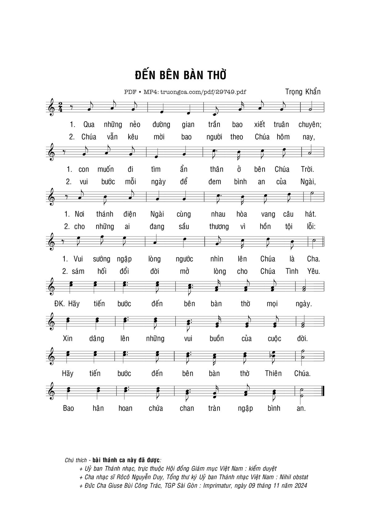 Sheet music Đến bên bàn thờ by Trọng Khẩn and PDF file was posted here to support you to practice singing perfectly. Sheets with notes and chords are for reference only, for non-commercial purposes only, not involved with earning money by buying and selling. Copyright is belong to song writer/author and copyright owner. Truongca.com do not own any copyrighted content. You can download the high-quality PDF files which contain staffs by PDF link above.