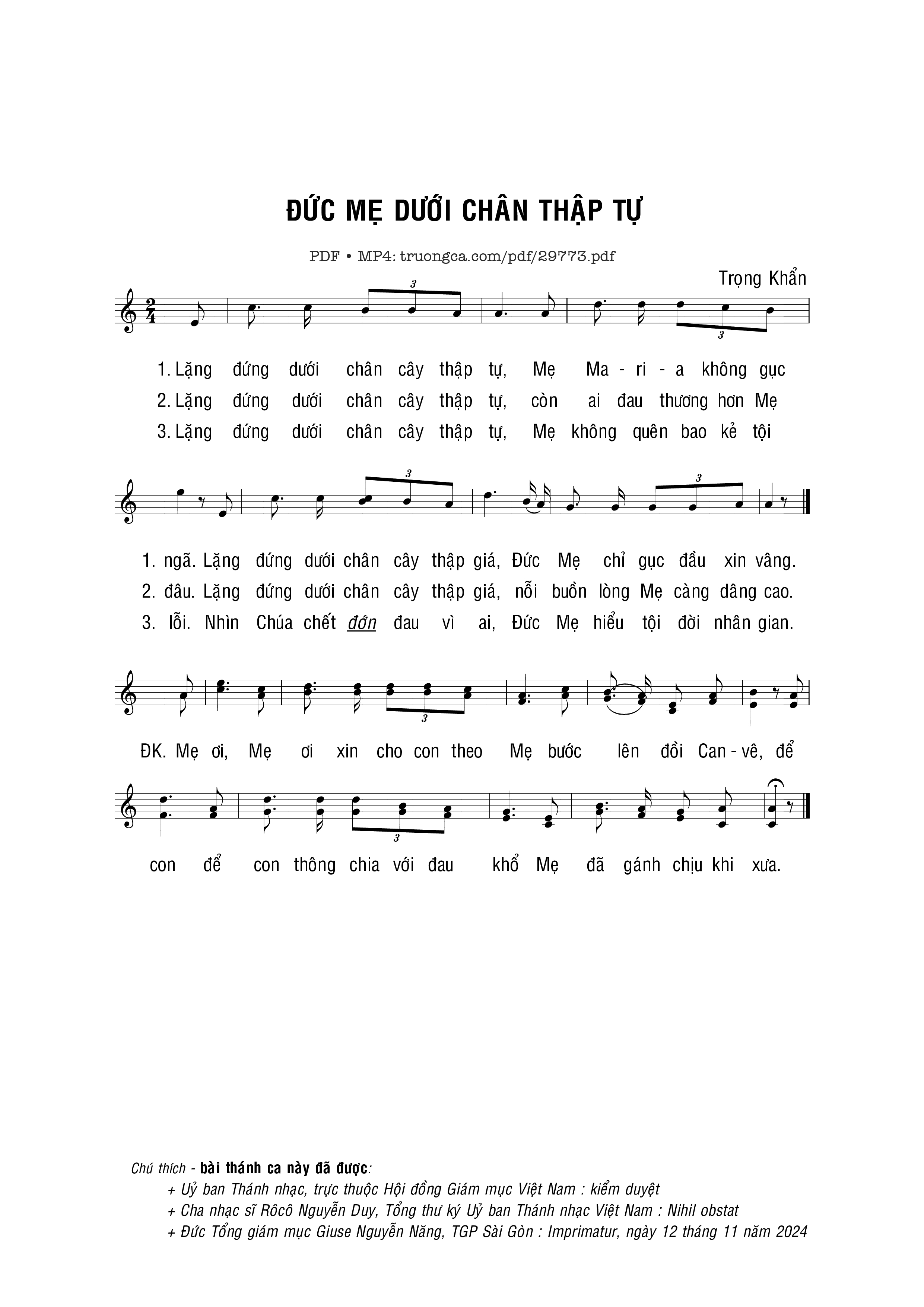 Sheet music Đức Mẹ dưới chân thập tự by Trọng Khẩn and PDF file was posted here to support you to practice singing perfectly. Sheets with notes and chords are for reference only, for non-commercial purposes only, not involved with earning money by buying and selling. Copyright is belong to song writer/author and copyright owner. Truongca.com do not own any copyrighted content. You can download the high-quality PDF files which contain staffs by PDF link above.