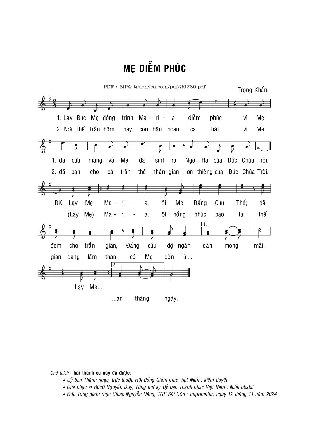 Sheet music Mẹ diễm phúc by Trọng Khẩn and PDF file was posted here to support you to practice singing perfectly. Sheets with notes and chords are for reference only, for non-commercial purposes only, not involved with earning money by buying and selling. Copyright is belong to song writer/author and copyright owner. Truongca.com do not own any copyrighted content. You can download the high-quality PDF files which contain staffs by PDF link above.