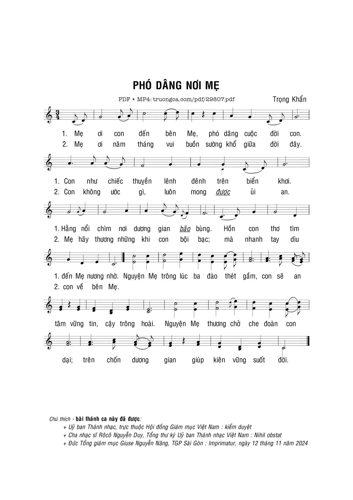 Sheet music Phó dâng nơi Mẹ by Trọng Khẩn and PDF file was posted here to support you to practice singing perfectly. Sheets with notes and chords are for reference only, for non-commercial purposes only, not involved with earning money by buying and selling. Copyright is belong to song writer/author and copyright owner. Truongca.com do not own any copyrighted content. You can download the high-quality PDF files which contain staffs by PDF link above.
