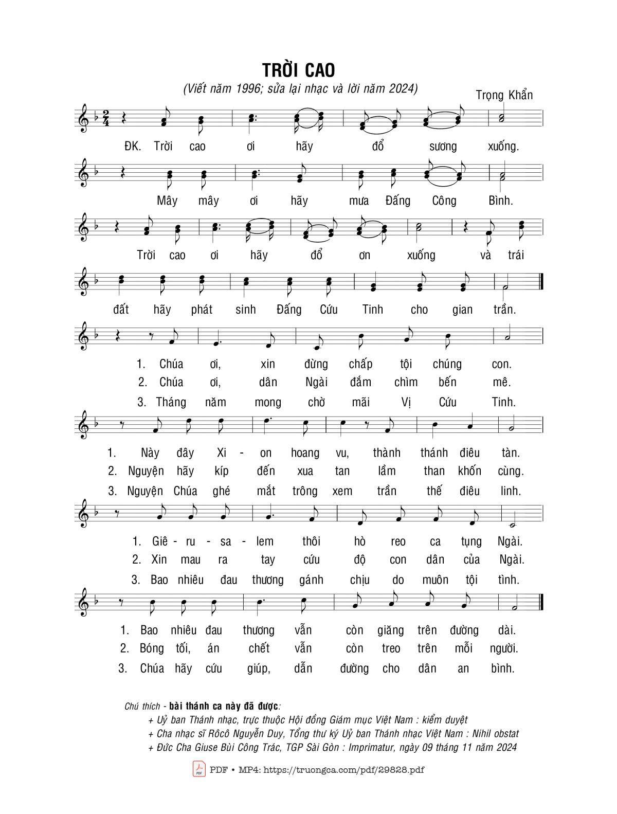 Sheet music Trời cao by Trọng Khẩn and PDF file was posted here to support you to practice singing perfectly. Sheets with notes and chords are for reference only, for non-commercial purposes only, not involved with earning money by buying and selling. Copyright is belong to song writer/author and copyright owner. Truongca.com do not own any copyrighted content. You can download the high-quality PDF files which contain staffs by PDF link above.
