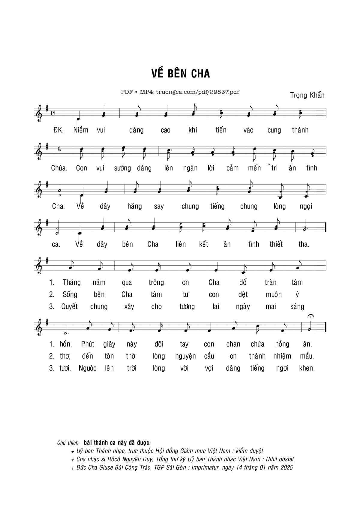 Sheet music Về bên Cha by Trọng Khẩn and PDF file was posted here to support you to practice singing perfectly. Sheets with notes and chords are for reference only, for non-commercial purposes only, not involved with earning money by buying and selling. Copyright is belong to song writer/author and copyright owner. Truongca.com do not own any copyrighted content. You can download the high-quality PDF files which contain staffs by PDF link above.