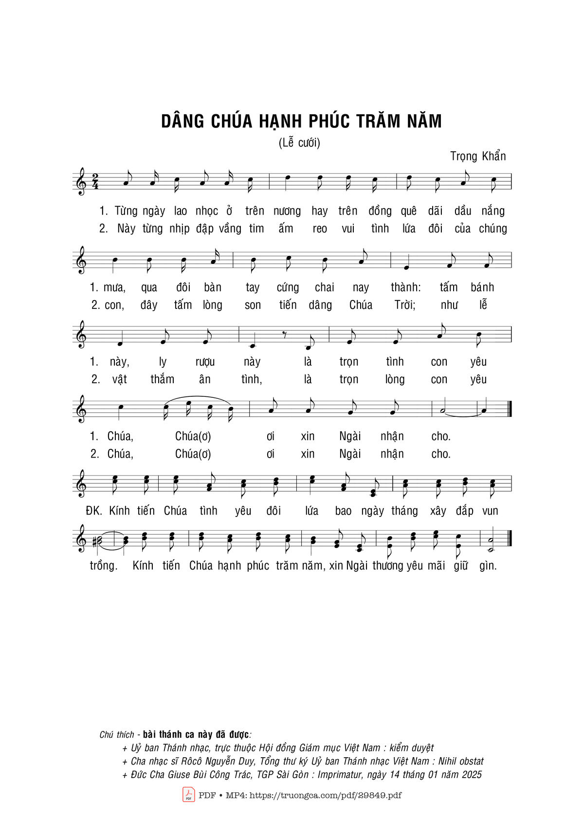 Sheet music Dâng Chúa hạnh phúc trăm năm by Trọng Khẩn and PDF file was posted here to support you to practice singing perfectly. Sheets with notes and chords are for reference only, for non-commercial purposes only, not involved with earning money by buying and selling. Copyright is belong to song writer/author and copyright owner. Truongca.com do not own any copyrighted content. You can download the high-quality PDF files which contain staffs by PDF link above.