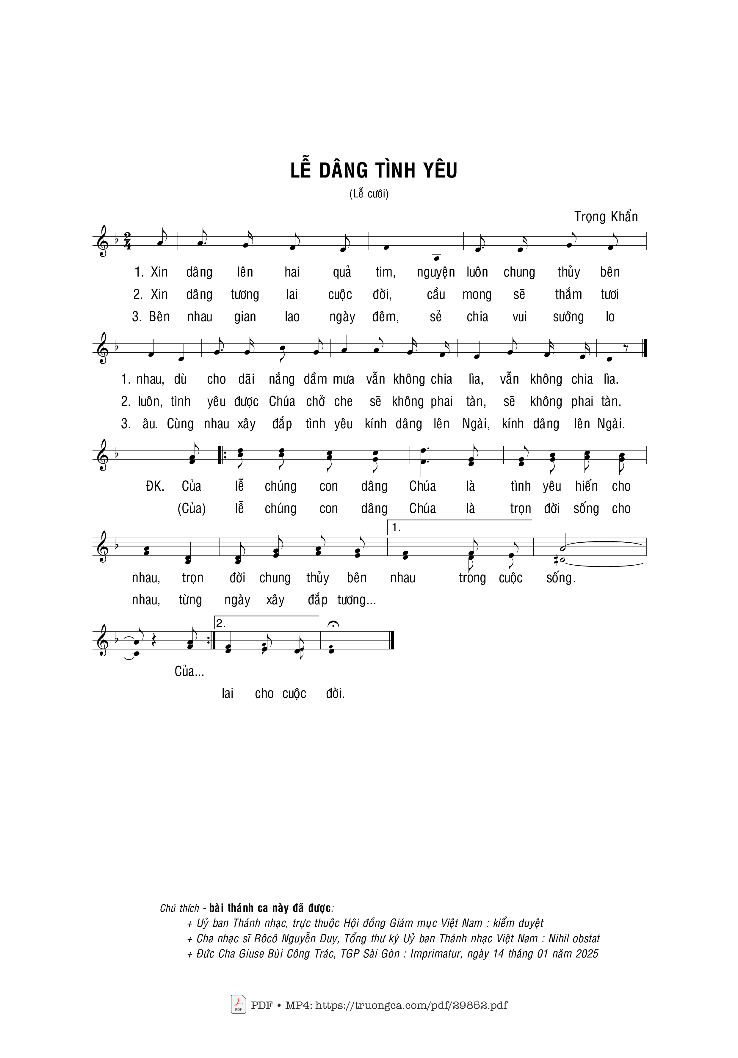 Sheet music Lễ dâng tình yêu by Trọng Khẩn and PDF file was posted here to support you to practice singing perfectly. Sheets with notes and chords are for reference only, for non-commercial purposes only, not involved with earning money by buying and selling. Copyright is belong to song writer/author and copyright owner. Truongca.com do not own any copyrighted content. You can download the high-quality PDF files which contain staffs by PDF link above.