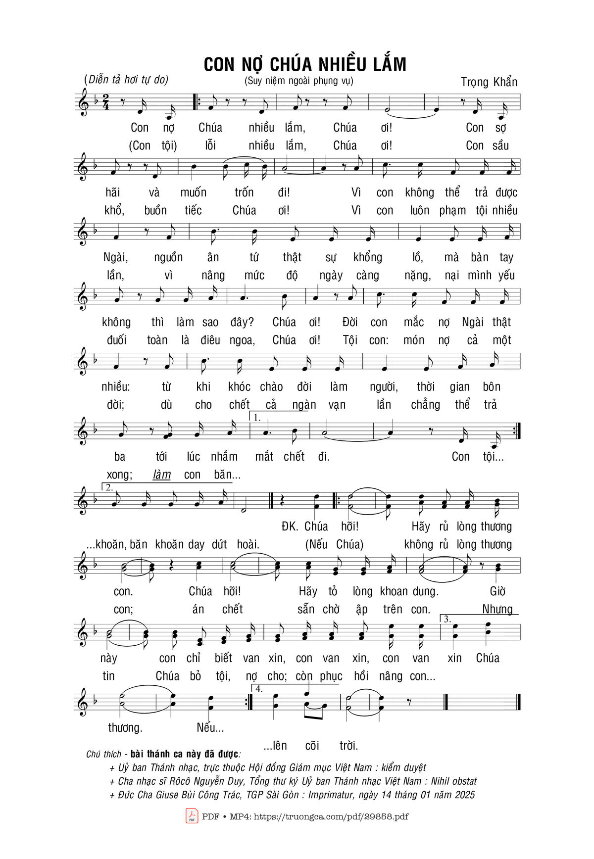 Sheet music Con nợ Chúa nhiều lắm by Trọng Khẩn and PDF file was posted here to support you to practice singing perfectly. Sheets with notes and chords are for reference only, for non-commercial purposes only, not involved with earning money by buying and selling. Copyright is belong to song writer/author and copyright owner. Truongca.com do not own any copyrighted content. You can download the high-quality PDF files which contain staffs by PDF link above.