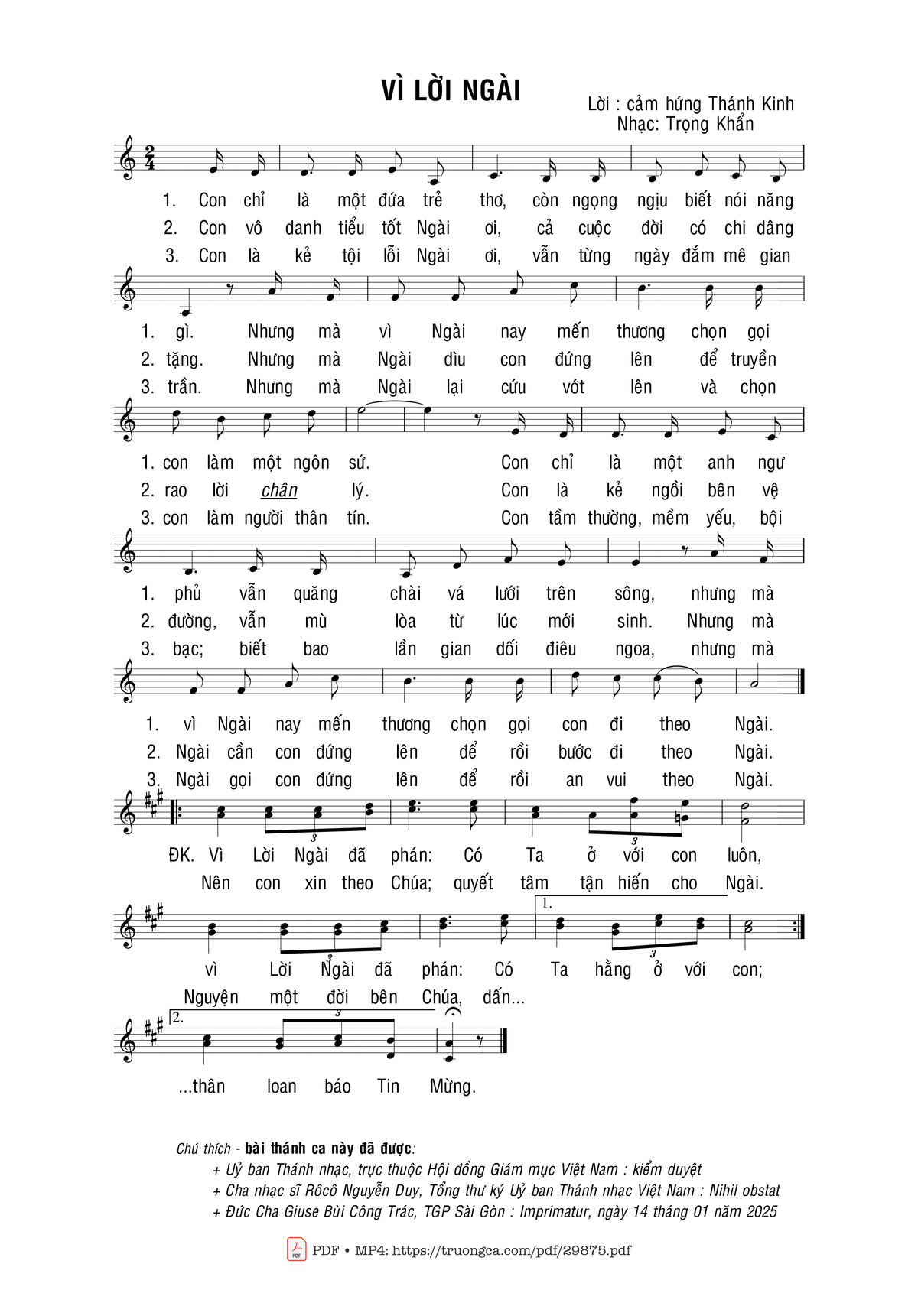 Sheet music Vì lời Ngài by Trọng Khẩn and PDF file was posted here to support you to practice singing perfectly. Sheets with notes and chords are for reference only, for non-commercial purposes only, not involved with earning money by buying and selling. Copyright is belong to song writer/author and copyright owner. Truongca.com do not own any copyrighted content. You can download the high-quality PDF files which contain staffs by PDF link above.